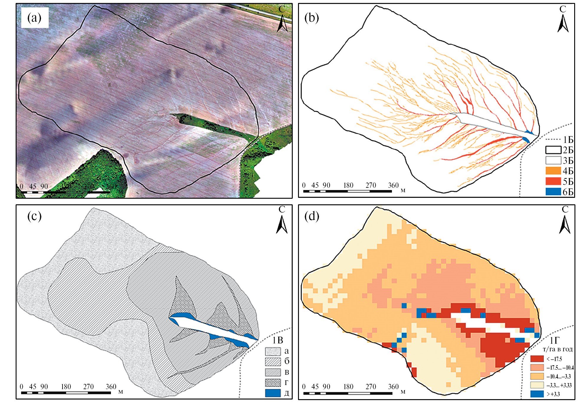 Рис. 2. a – ортофотоплан водосбора Ломовец; b – карта-схема сети промоин и крупных конусов выноса; c – карта эродированности почвенного покрова; d – карта расчетных темпов эрозионно-аккумулятивных процессов на водосборе Ломовец. 1Б – грунтовая дорога; 2Б – граница водосбора; 3Б – граница залуженной с отдельными деревьями и кустарниками части водосбора; 4Б – небольшие промоины; 5Б – крупные промоины, в основном сформировавшиеся по днищам потяжин, хорошо выраженным в рельефе; 6Б – крупные конуса выноса на краю пашни; 1В – степень смытости почв: а – несмытые, б – слабо-, в – средне-, г – сильносмытые, д – намытые; 1Г – темпы эрозии почв (–) и аккумуляции наносов (+).