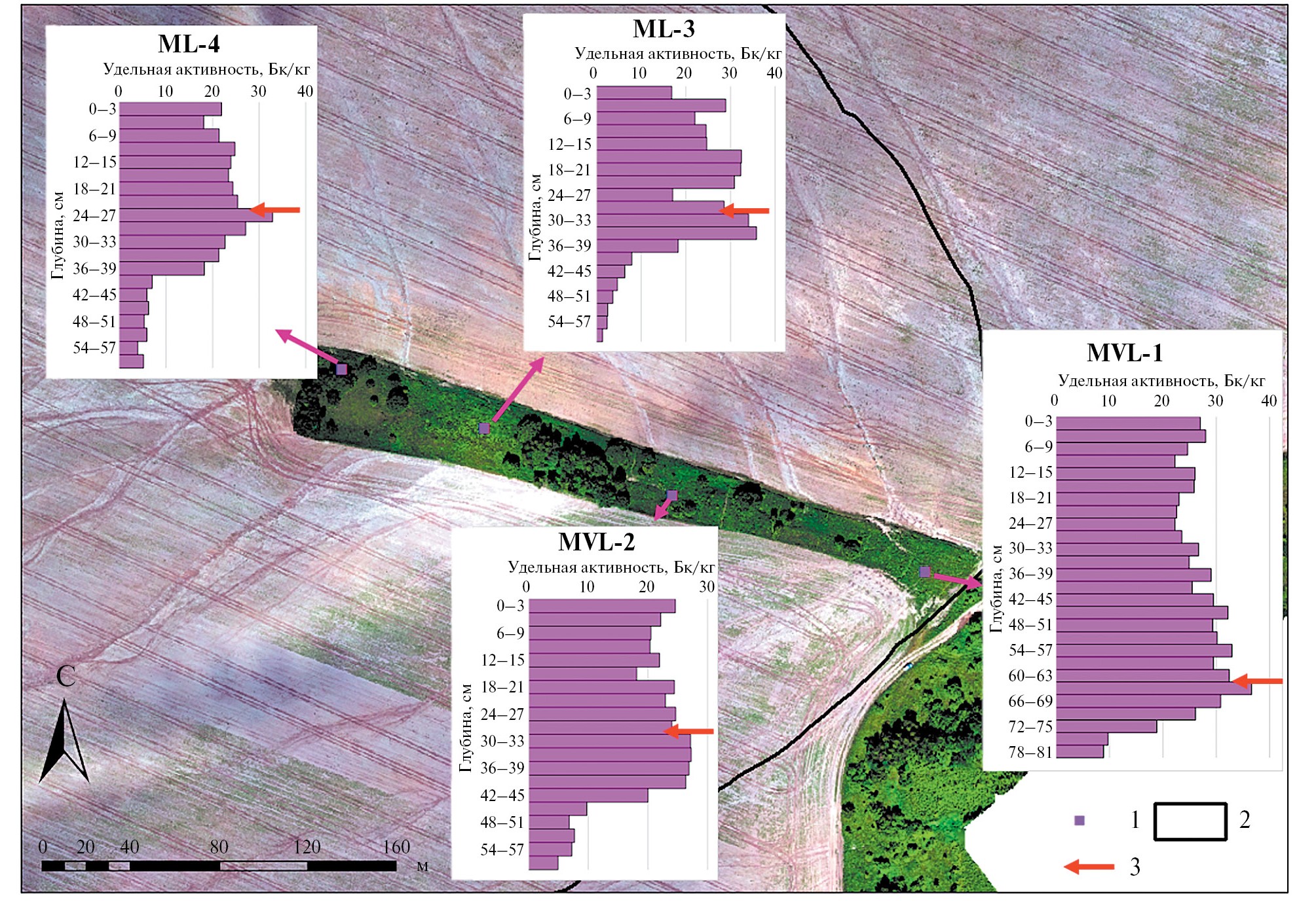 Рис. 3. Расположение почвенных разрезов в днище балки и эпюры распределения удельной активности 137Cs по глубине. 1 – местоположение разреза; 2 – грунтовая дорога, 3 – предполагаемая поверхность на момент выпадения 137Cs в 1986 г.