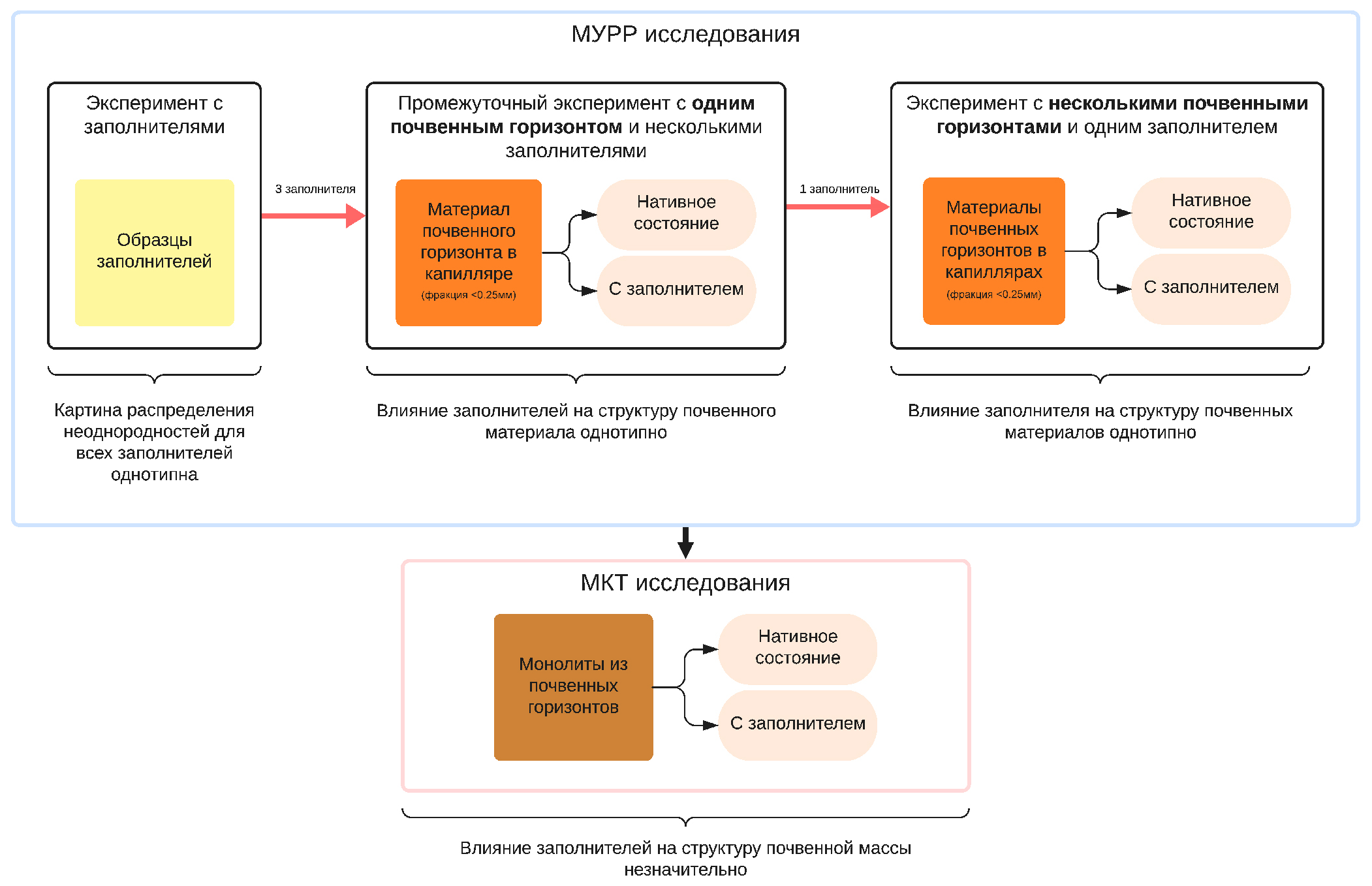 Рис. 2. Блок-схема проведения эксперимента по оценке влияния заполнителя на характер порового пространства почвы с использованием МУРР и КТ методов