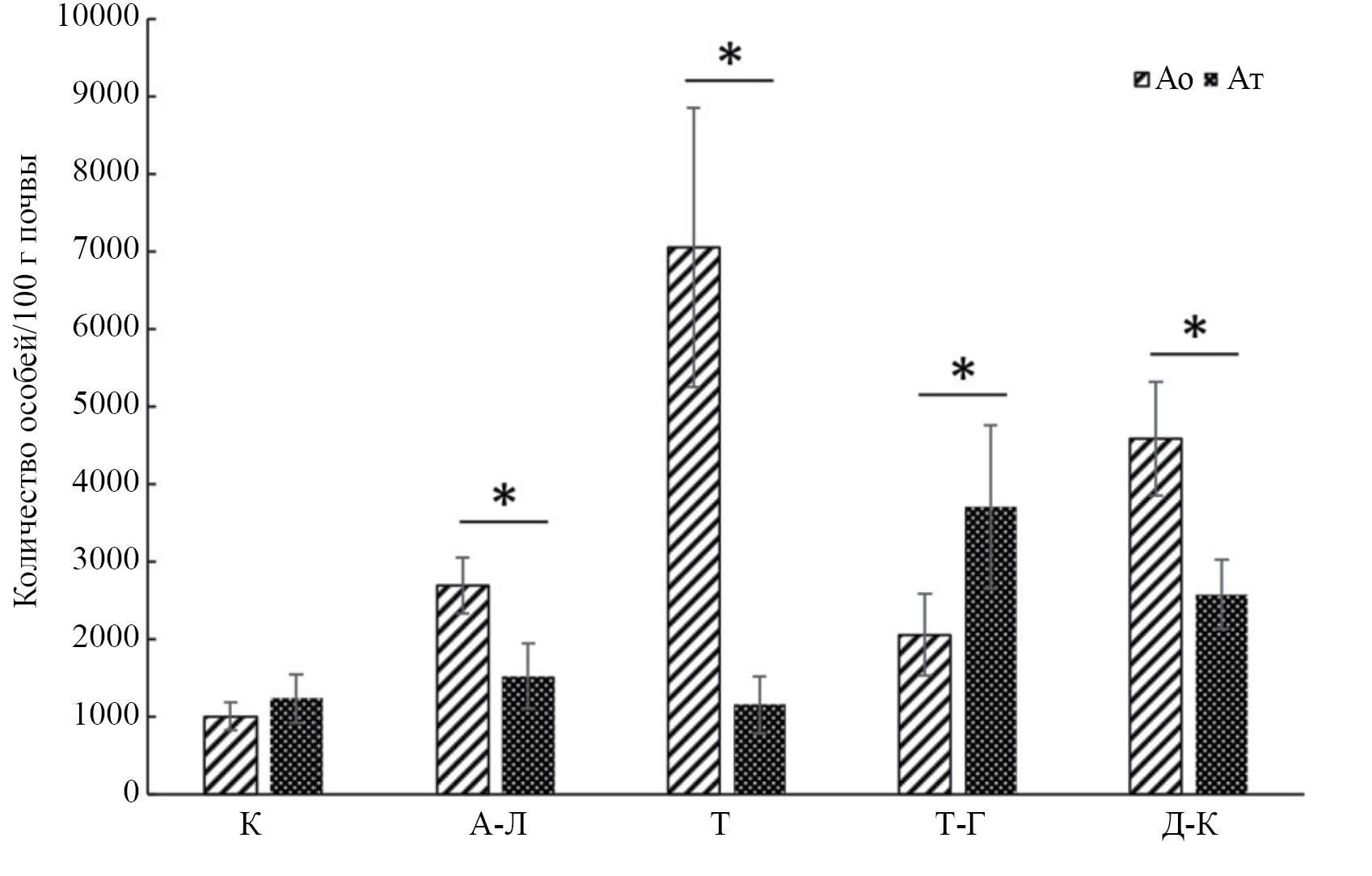 Рис. 1. Общая численность нематод в почвах Южной Чукотки (экз./100 г почвы). Данные представляют среднее значение ± стандартное отклонение. Повторность пятикратная. Символ * показывает значимое отличие параметра между подстилочным и торфяным горизонтами (p < 0.05). Расшифровка названия почв дана в табл. 1 Ао – подстилка (0–3 см) и Ат – торфяной горизонт (3–10 см)
