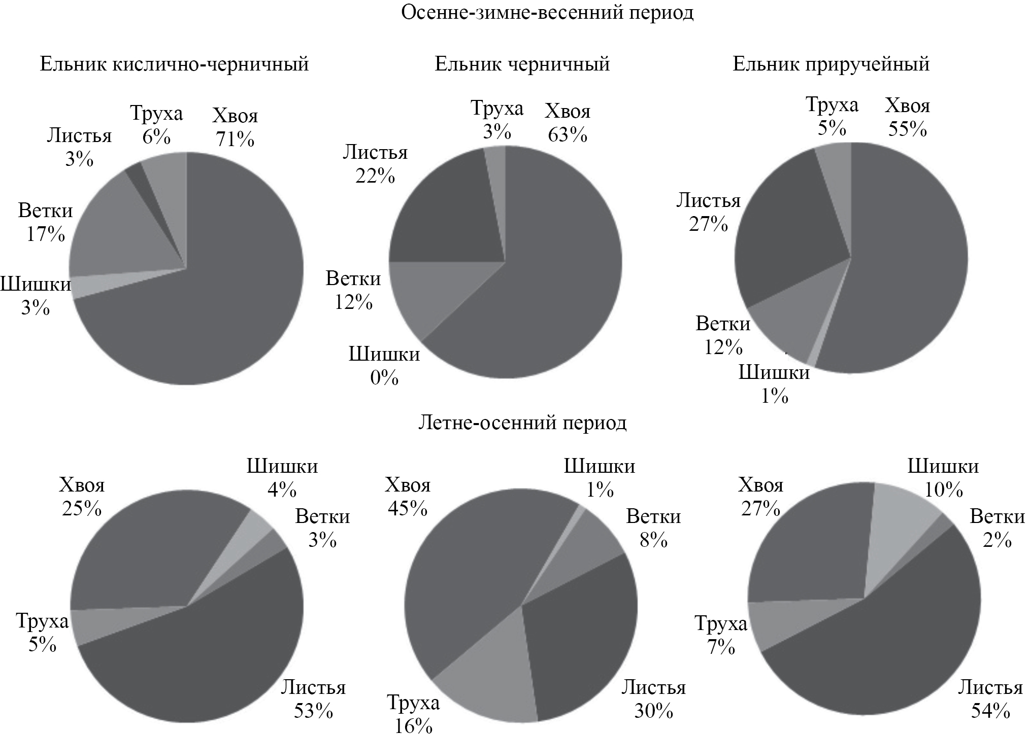 Для анализа качества растительного опада в лабораторных условиях определяли его компонентный состав, разделяя общую массу на структурно-функциональные компоненты (фракции), выделяемые по морфологической, функциональной и видовой принадлежности: ветви, кора, шишки, хвоя, листья и неидентифицированные остатки (труха). Опад всех фракций высушивали, затем взвешивали и рассчитывали процентное соотношение фракций от общей массы сухого опада.