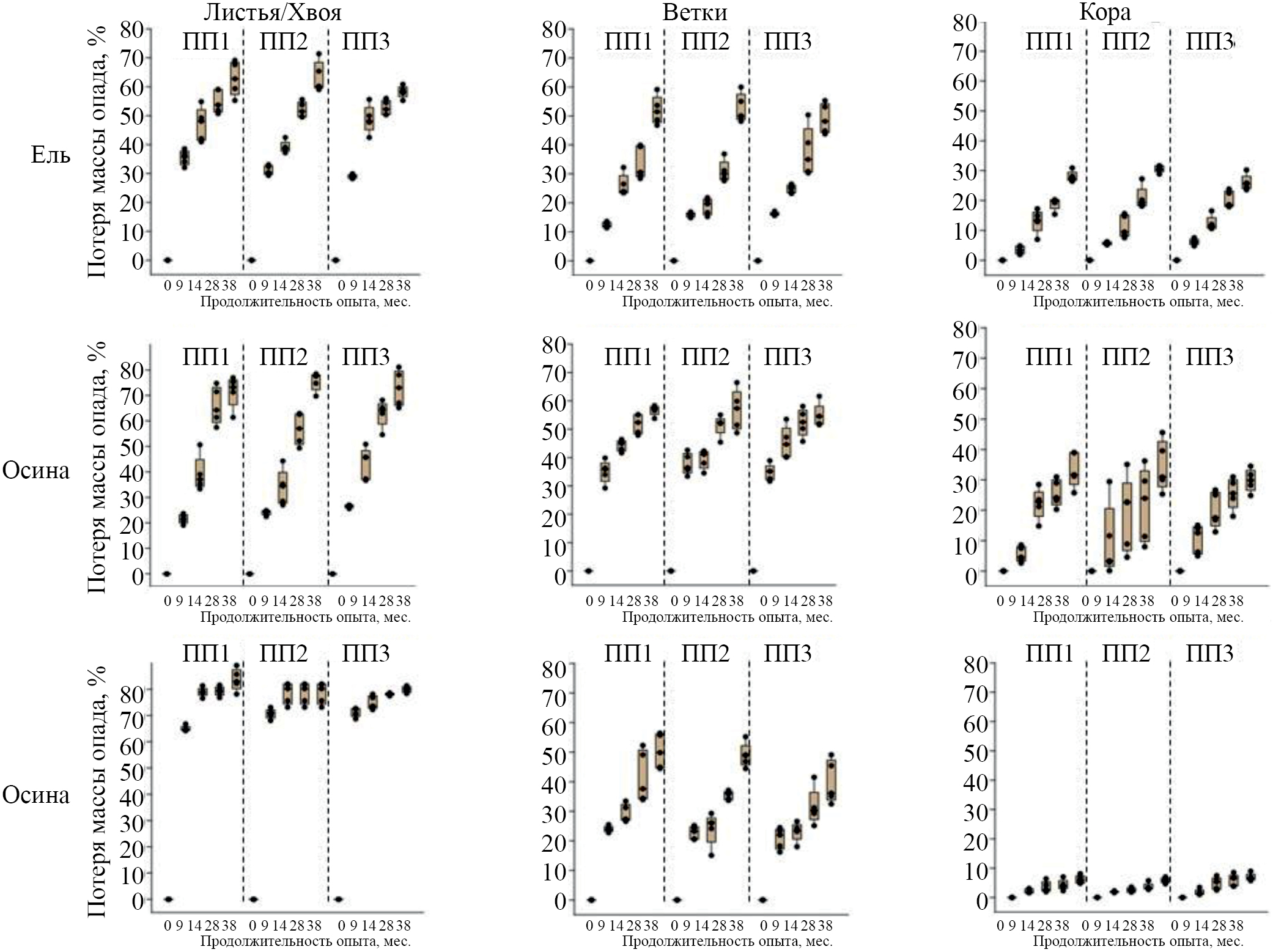 Анализ скорости разложения растительного опада in situ проводили в полевых экспериментах разной продолжительности – от одного полевого сезона [1, 3, 8, 9] до нескольких лет [6, 24, 20, 45, 52]. Исследования процессов разложения опада с большим набором нативных растительных материалов представляют большую ценность для понимания круговорота органического вещества в лесах, но являются редкими в связи с трудоемкостью и длительностью эксперимента [34].
