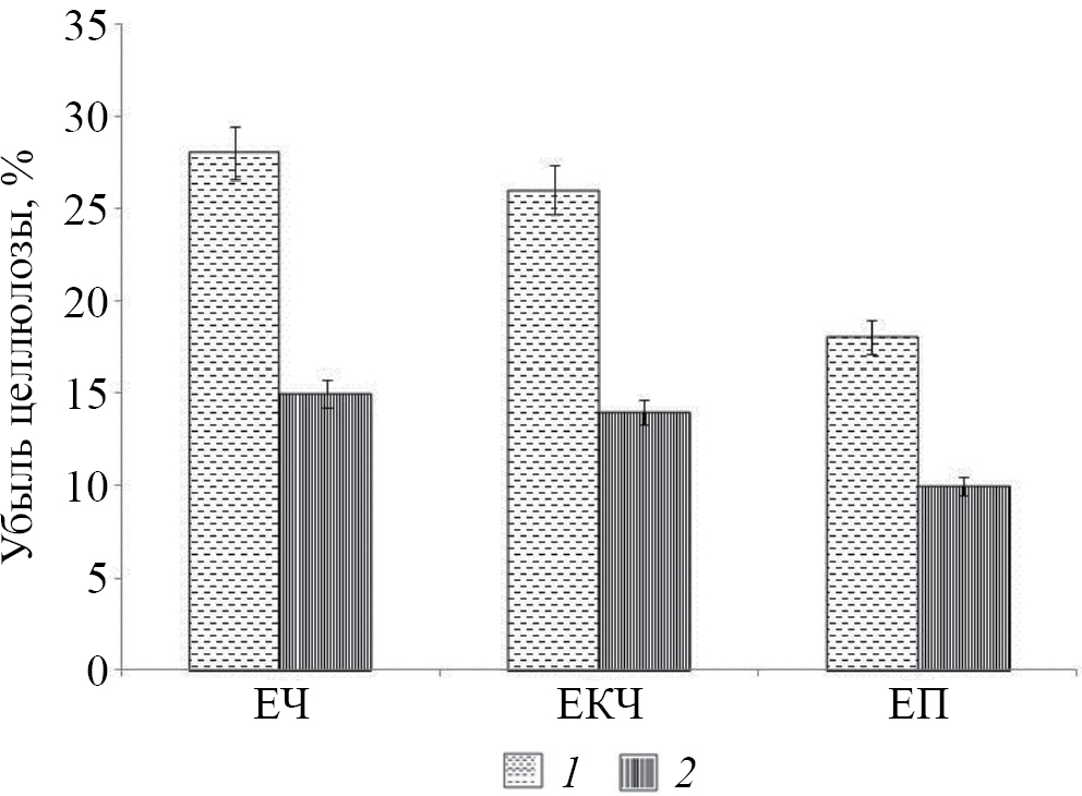 Рис. 3. Целлюлозолитическая активность лесной подстилки (1) и подподстилочного минерального горизонта (2) эллювиально-метаморфической почвы старовозрастных среднетаежных ельников.