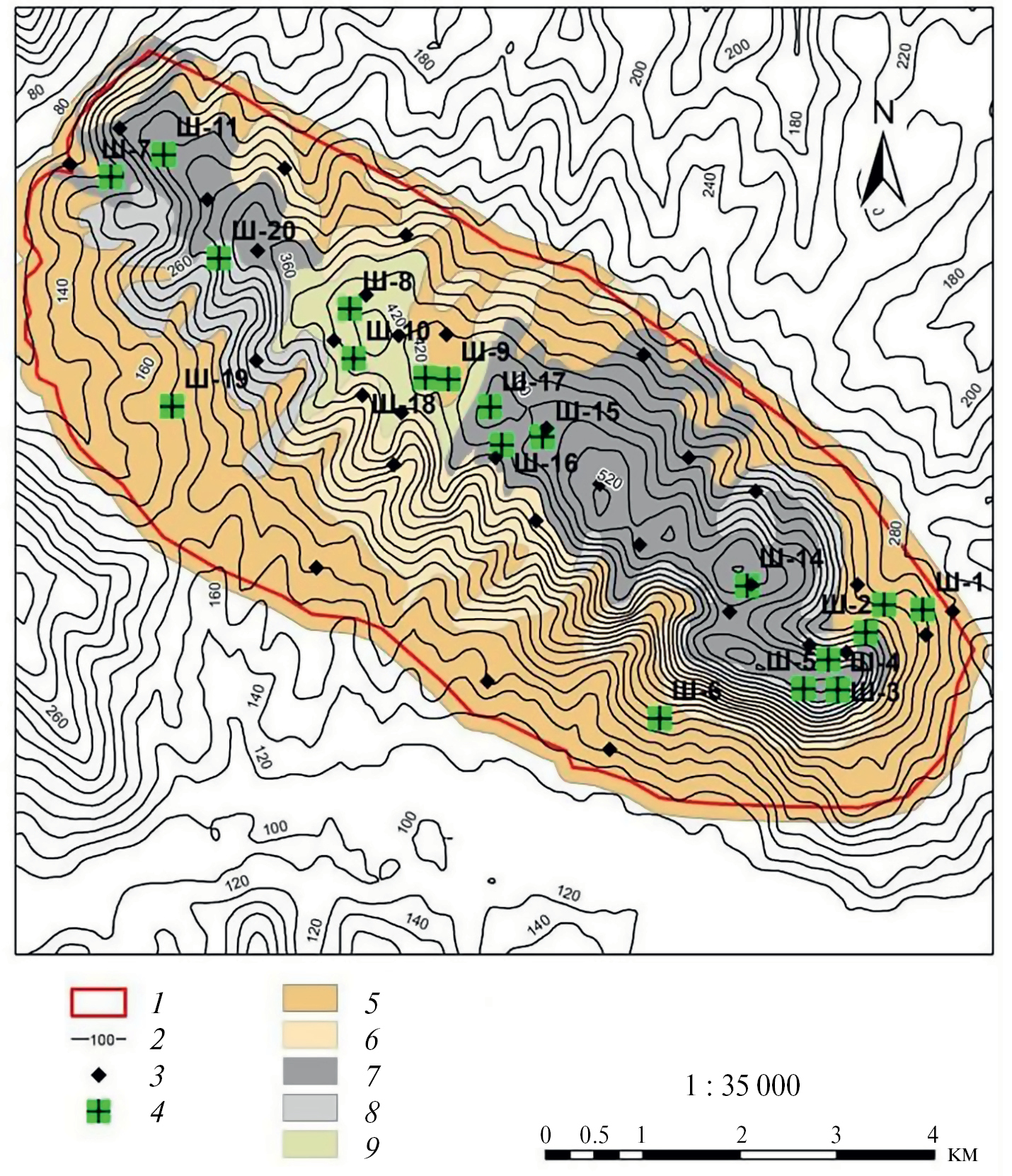 Рис. 1. Почвенная карта территории ООПТ “Гора Шизе – хр. Грузинка” (1 – граница ООПТ гора Шизе; 2 – изолинии высот; 3 – поверхностные образцы; 4 – почвенные разрезы; 5 – бурые лесные слабоненасыщенные почвы; 6 – бурые лесные неполноразвитые; 7 – дерново-карбонатные выщелоченные мощные; 8 – дерново-карбонатные выщелоченные маломощные; 9 – дерново-карбонатные выщелоченные поверхностно-глееватые).