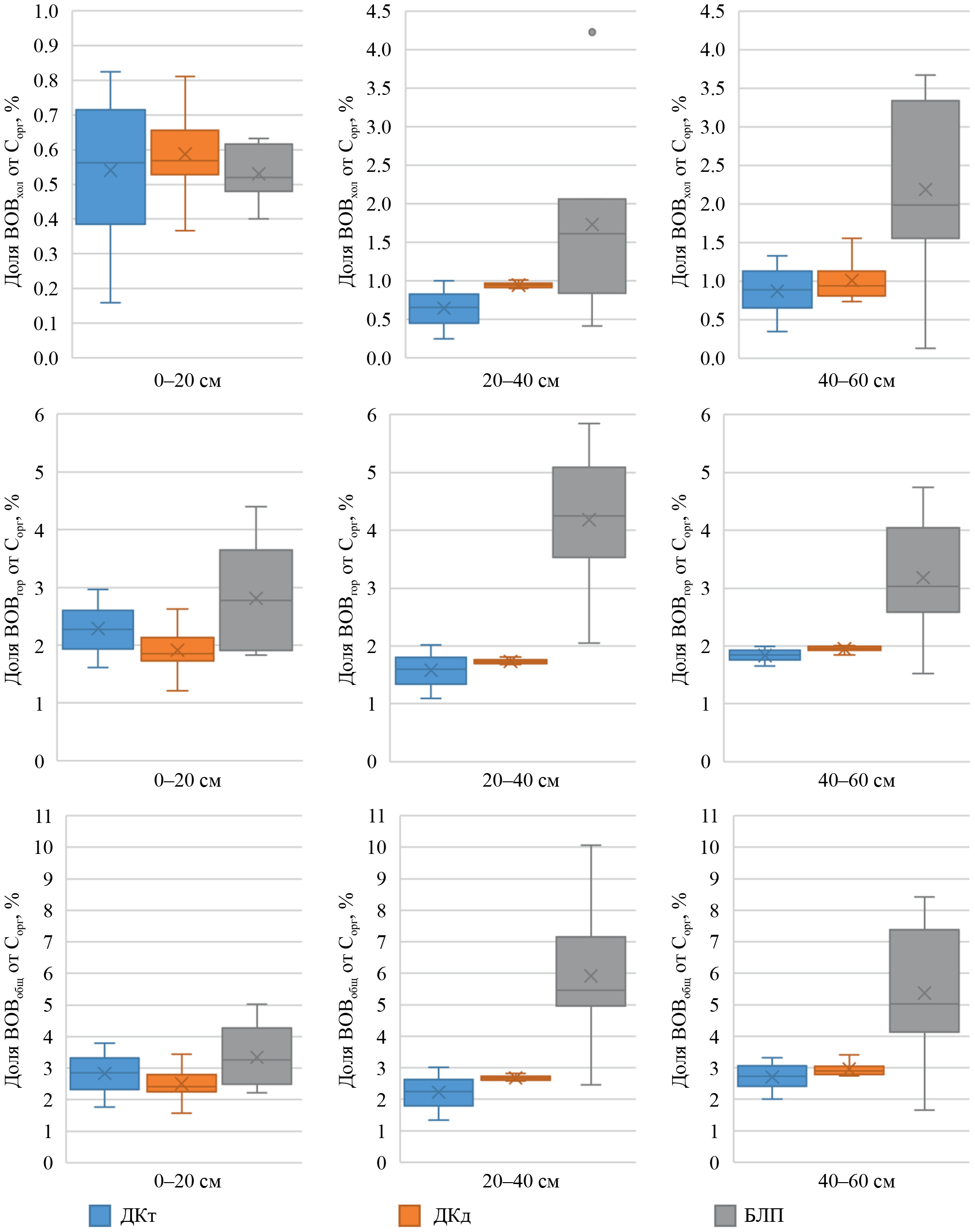 Если рассмотреть долю ВОВ в составе органического углерода послойно, то (рис. 3) отмечаются высокие значения медианы, а также большой разброс значений в выборках бурых лесных почв, за исключением ВОВ холодной экстракции в слое 0–20 см. При этом медианы выборок в дерново-карбонатных почвах зачастую сопоставимы. Значения медианы относительного содержания ВОВ холодной экстракции возрастают с глубиной во всех выборках. Данные, полученные в вытяжках горячей экстракции, показали максимальную долю подвижного ВОВ в бурых лесных почвах на глубине 20–40 см. При этом в дерново-карбонатных почвах под древесными фитоценозами медиана по профилю в целом статична и находится пределах 1.73–1.96%. Минимальные значения медианы обнаружены в выборках дерново-карбонатных почв под травянистыми фитоценозами в слое 20–40 см. В целом доля общего ВОВ от Сорг во многом повторяет профильное распределение ВОВ при горячей экстракции.