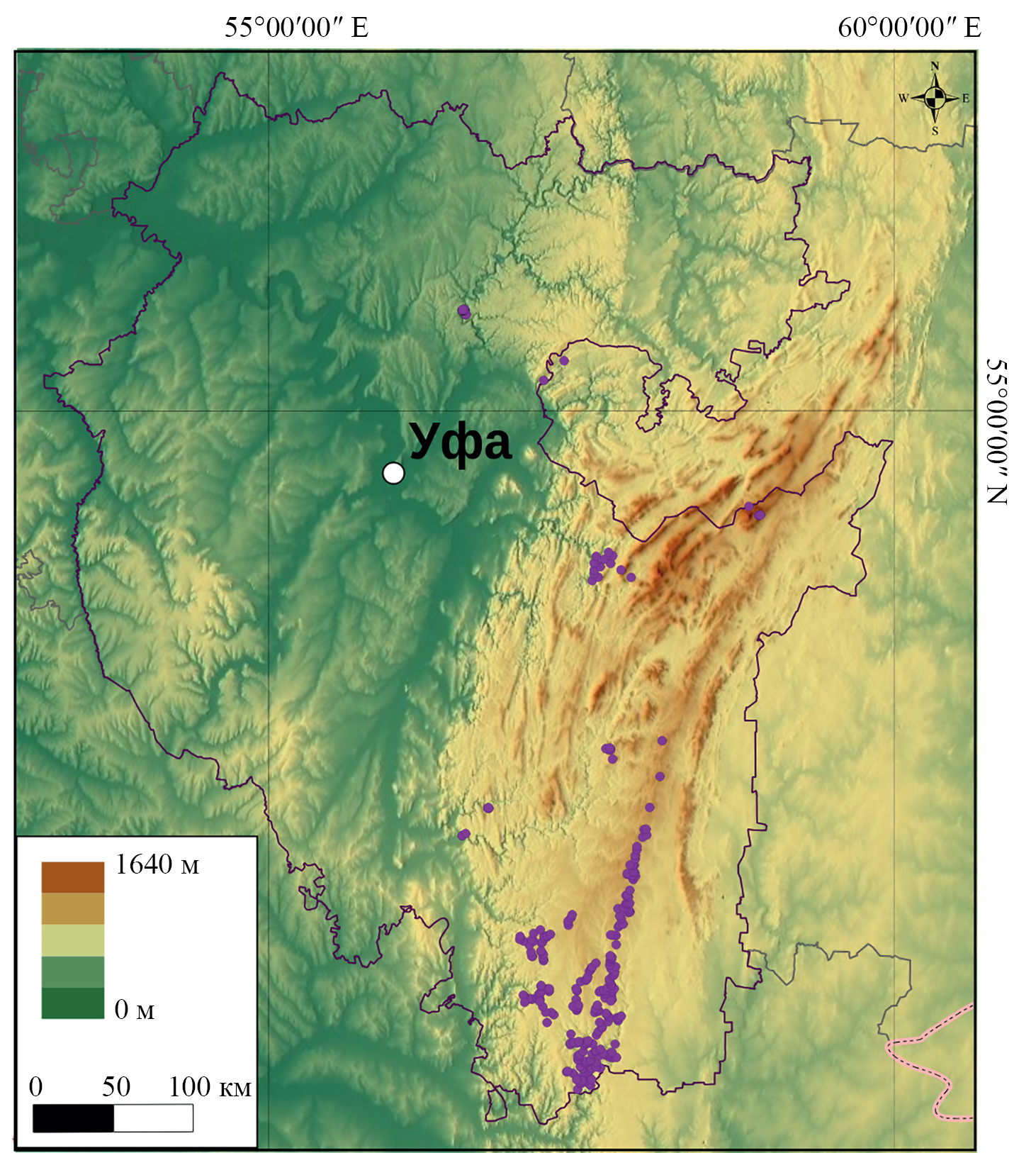 Исследование проводили в южной части Уральских гор на вытянутом участке, протяженностью 420 км с севера на юг, на территории Республики Башкортостан (рис. 1). Климат умеренно теплый, засушливый. Средняя температура июля +18–20°С, января – –17°С. Количество осадков 270–308 мм [14]. Лес представлен преимущественно березами (Betula pendula), соснами (Pinus sylvestris), елью (Picea obovata Ledeb.), пихтами (Abies sibirica Ledeb.) [18]. Преобладающие типы почв – горные серые лесные (Eutric Retisols (Loamic, Cutanic, Humic)), темно-серые лесные (Luvic Retic Greyzemic Someric Phaeozems (Loamic)) и литоземы серогумусовые (Eutric Leptosols (Loamic, Humic)) [3]. Западная часть гор включает осадочные (карбонатные) породы, восточная часть – магматические [11].