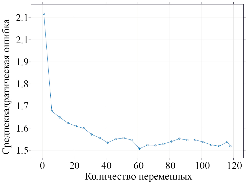 Отсев переменных окружающей среды. На рис. 2 представлен результат отсева переменных с использованием алгоритма РИК. Видно, что при использовании 61 переменной достигаются лучшие результаты модели, согласно RMSE значению. Кривая резко падает до около 40–41 переменных, а затем остается на плато.