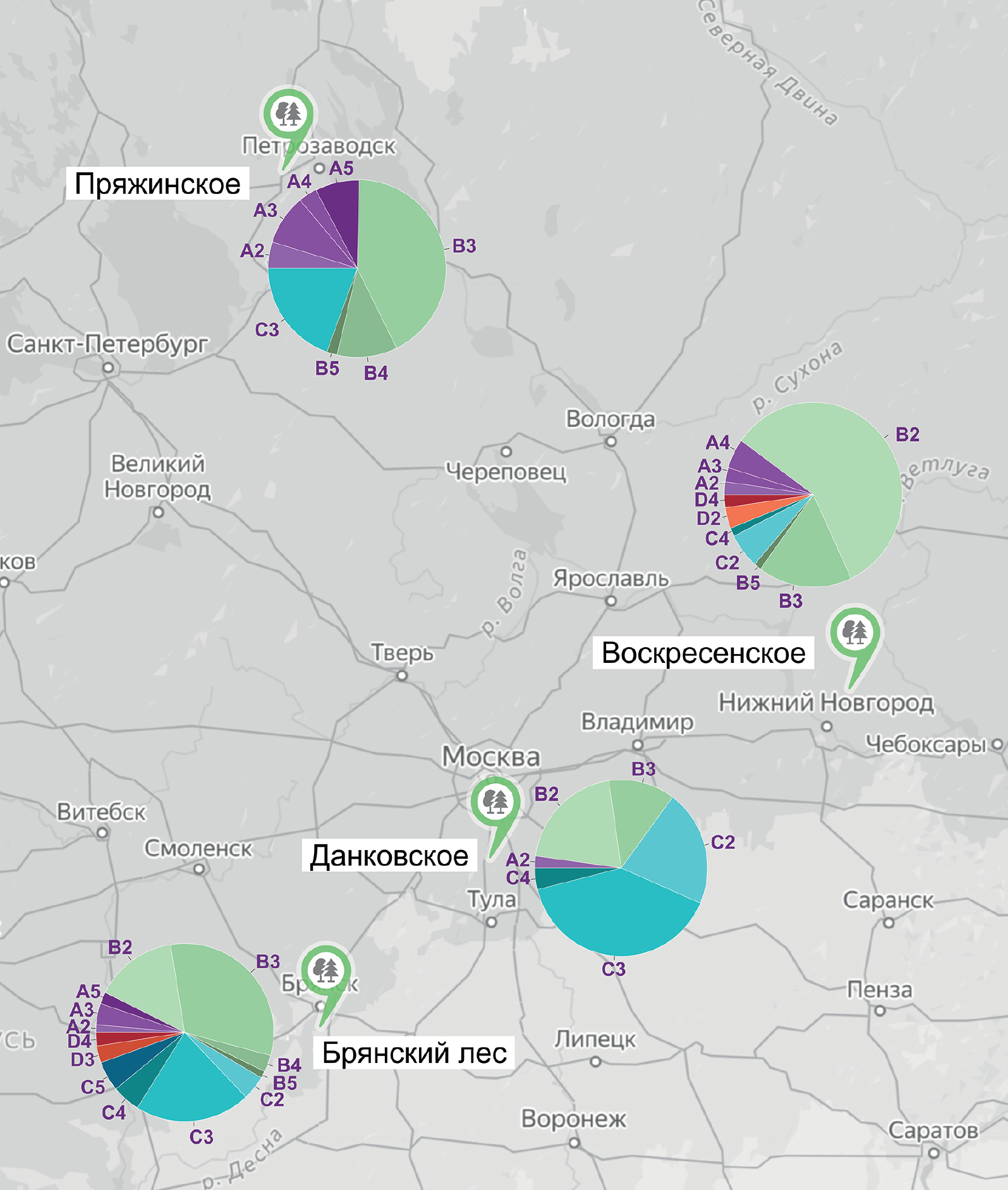 Входные данные для вычислительных экспериментов. Пространственное разнообразие почвенно-растительных условий в пределах каждой из рассматриваемых территорий определено по данным лесной таксации. Для характеристики эдафических условий биотопов в российском лесоведении традиционно используется классификация ТЛУ по системе Крюденера–Алексеева–Погребняка [2, 25]. В соответствии с этой классификацией, разнообразие условий произрастания лесов европейской части России по богатству почв элементами питания подразделяют на 4 градации: бедные (условное обозначение А), относительно бедные (B), относительно богатые (С), богатые (D). По степени увлажнения выделяют сухие (1), свежие (2), влажные (3), сырые (4), мокрые (5). Соответственно, варианты ТЛУ имеют буквенно-численные обозначения, например, А2, В3, С2 и т.п. (табл. S2). Соотношение количества таксационных выделов разных ТЛУ для объектов исследования представлено на рис. 1.