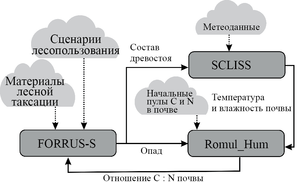 Проведенная ранее интеграция моделей (рис. 2) позволила реализовать обмен данными между ними [3]. FORRUS-S передает в Romul_Hum данные о количестве растительного опада (отдельно по каждому древесному виду и фракции фитомассы – стволов с корой, ветвей, листвы или хвои, скелетных и тонких корней), а в SCLISS – данные о составе древесного яруса (его видовой состав и общая сомкнутость крон). SCLISS использует данные о видовом составе и сомкнутости древостоя для конверсии метеорологических данных в показатели гидротермических условий почвенных горизонтов, влияющих на коэффициенты скоростей трансформации растительных опадов в модели Romul_Hum. SCLISS передает в Romul_Hum данные о температуре органогенного (лесная подстилка) и органо-минеральных горизонтов, данные об объемной влажности тех же горизонтов, а также расчетные значения влажности завядания, наименьшей полевой влагоемкости и полной влагоемкости органо-минеральных горизонтов. В свою очередь, Romul_Hum передает в SCLISS данные о содержании углерода в подстилке, что используется для расчета объемной плотности подстилки. Таким образом, комплекс моделей FORRUS-S – Romul_Hum – SCLISS позволяет динамически оценивать влияние изменений в структуре древесной растительности (вследствие естественного развития древостоев или лесохозяйственной деятельности) на условия под пологом леса, динамику запасов и распределение органического вещества в лесных почвах.
