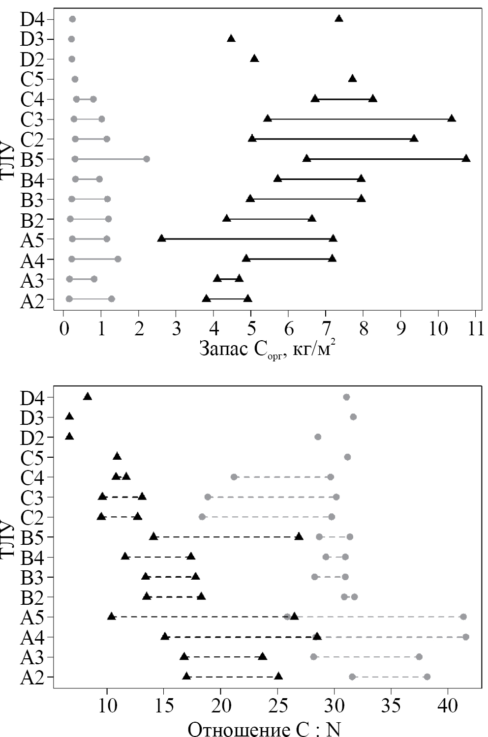 Рис. 3. Диапазон запасов ПОВ и C : N в почвах разных ТЛУ (серый цвет – данные для лесной подстилки, черный – для органо-минеральной части профиля почв).