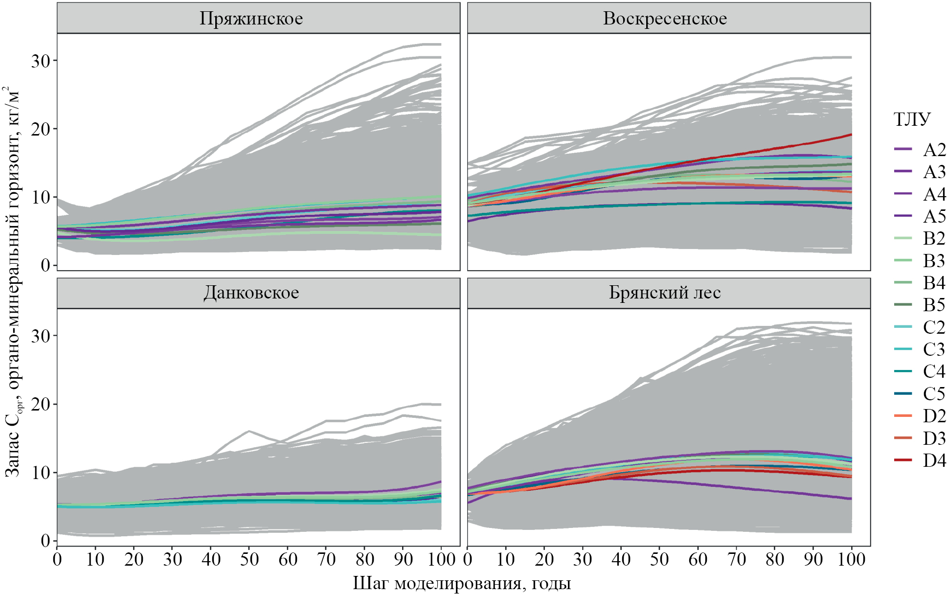 Обработка данных. Расчеты запасов ПОВ для временного отрезка 100 лет с шагом 1 год выполняли для каждого таксационного выдела с учетом соответствующих ему начальных характеристик древостоя (видовой состав, возраст и другие таксационные показатели) и почвенных данных (запасы Сорг и Nобщ в органогенных горизонтах лесной подстилки и органо-минеральной части профиля, гранулометрический состав и др.). В качестве средней оценки динамики показателей для разных вариантов ТЛУ на каждом из объектов исследования использовали медианные значения. Проведены расчеты стока углерода в почвах за 100 лет для территорий объектов исследования на основе суммирования данных всех таксационных выделов с учетом занимаемой ими площади. Также для территорий исследования оценивали накопление углерода в древостоях и других компонентах лесных экосистем, что позволило определить вклад почв в нетто-поглощение углерода.