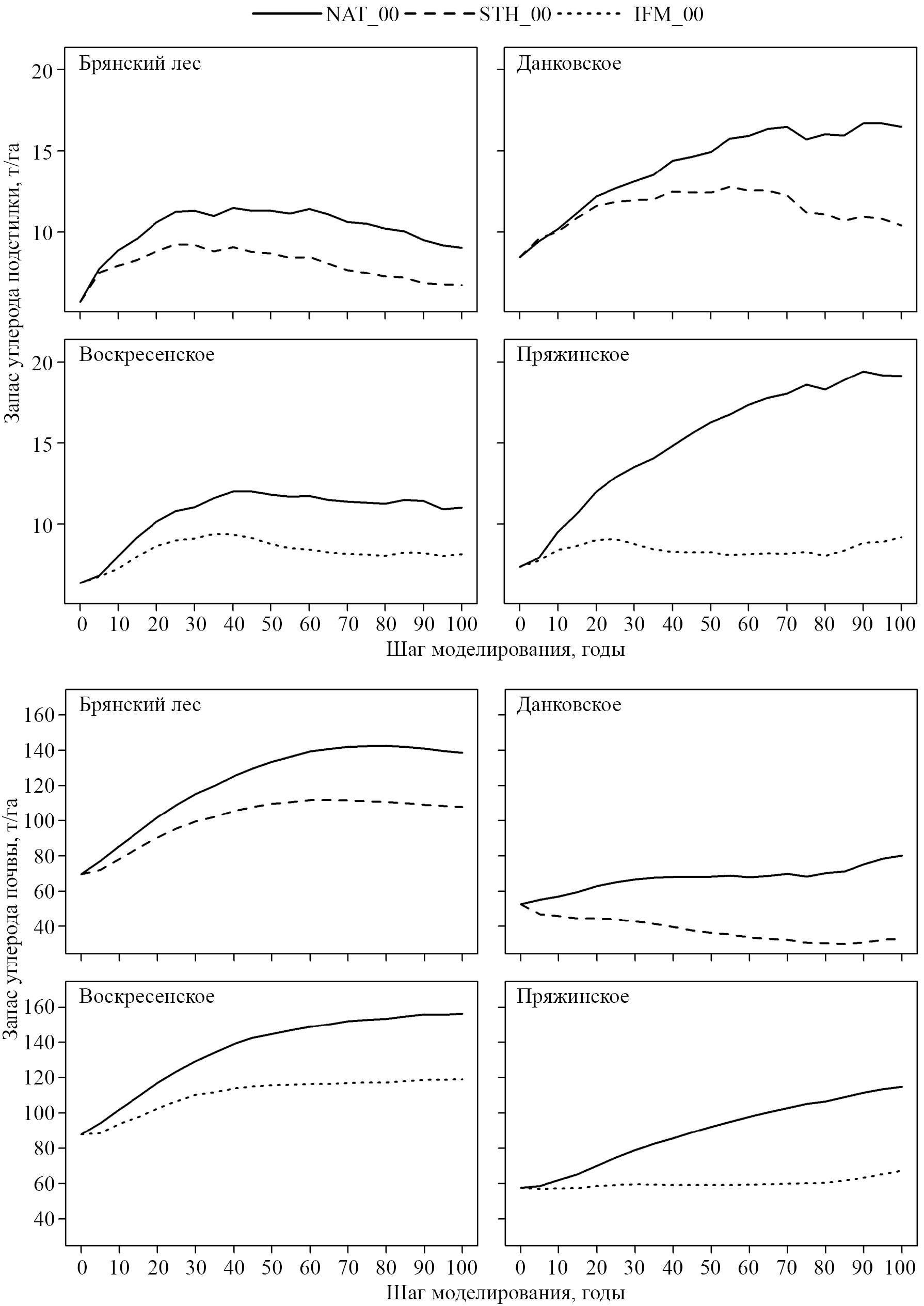 Сценарии выборочных рубок (STH) для заповедника “Брянский лес” и интенсивного лесопользования с применением сплошных рубок (IFM) для Воскресенского лесничества, несмотря на изъятие части древесной биомассы и удаление порубочных остатков, предполагают увеличение почвенных запасов Сорг в органо-минеральной части почв, но рассчитанные результирующие значения за 100 лет ниже примерно на 35–40 т/га, чем в сценарии естественного развития лесов при заповедном режиме. Запасы подстилки для этих объектов возрастают примерно на 5–6 т/га в течение первых 40 лет модельного периода, после чего динамика показателей повторяет изменение запасов в сценарии заповедания, но на более низком уровне. Для Пряжинского лесничества модельные оценки в сценарии IFM показывают сохранение углеродного пула подстилки и органо-минеральных горизонтов почв, близкое к первоначальным запасам. Для территории Данковского лесничества динамика запасов углерода в сценарии STH свидетельствует о сокращении пула ПОВ в органо-минеральной части профиля примерно на 20 т/га за 100 лет, не компенсируемое небольшим ростом запасов углеродного пула подстилки, которое оценивается в 2–5 т/га.