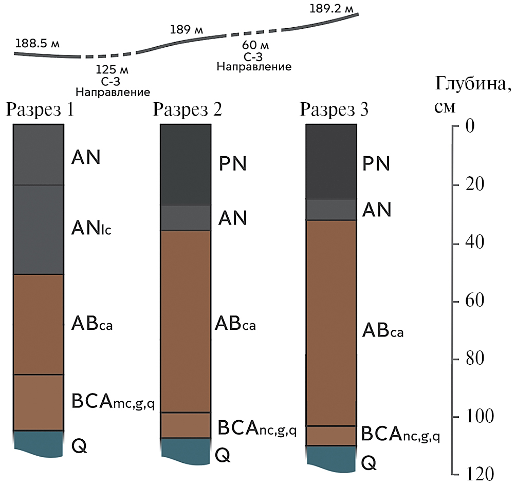 Почвы. Морфологические свойства. Пахотные почвы и залежная почва (рис. 2) близки по морфологическому строению. Для них характерен мощный гумусовый профиль, присутствие карбонатов и срединный горизонт с явными признаками переувлажнения. Формула почвенного профиля почвы залежи (в скобках указана нижняя граница горизонта, см) согласно [12]: AN(20)–ANlc(53)–ABca(85)– BCAmc,g,q(106)–Q. В отличие от почвы залежи, в пашне верхний горизонт является агрочерногумусовым (PN), мощностью 25–28 см, а залегающий глубже черногумусовый горизонт не содержит лабильных форм карбонатов (отсутствует признак lc). Формула почвенного профиля пахотных почв состоит из следующего набора горизонтов: PN – AN – ABca – BCAnc,g,q–Q. Мощность гумусового профиля пахотных почв, в целом, соответствует таковой почвы залежи и варьирует в пределах 85–100 см. Глубина вскипания сильно отличается – она составляет 20 см в залежной почве и около 40 см в почвах пашни. Вторичные формы карбонатов представлены пропиточными формами, белоглазкой, журавчиками. Последние встречаются только в пахотных почвах. Морфохроматические признаки переувлажнения в виде оливковых пятен, небольших сизоватых и сизовато-охристых зон вблизи мелких пор и трещин диагностированы на глубине 85 см в почве залежи и 100–110 см в почвах пашни, железо-марганцевые примазки и конкреции – с 70 (разрез 1) и 80–90 см (разрезы 2, 3). Почвы диагностированы как лугово-черноземные пахотные и лугово-черноземные согласно Классификации и диагностике почв СССР (1977) и черноземы квазиглеевые миграционно-мицелярные глееватые (разрез 1), агрочерноземы квазиглеевые конкреционные глееватые (разрезы 2, 3) согласно Полевому определителю почв [12].