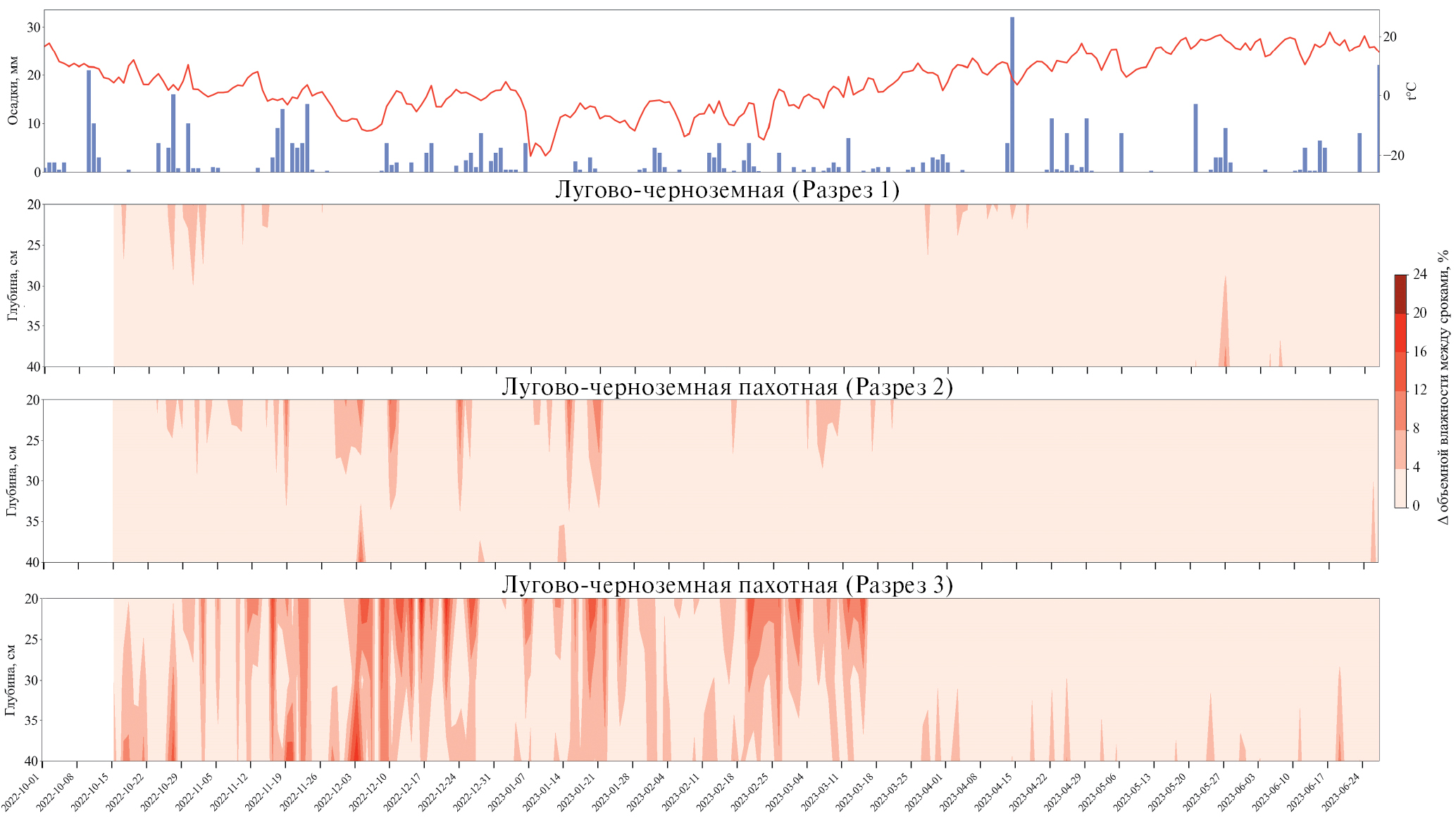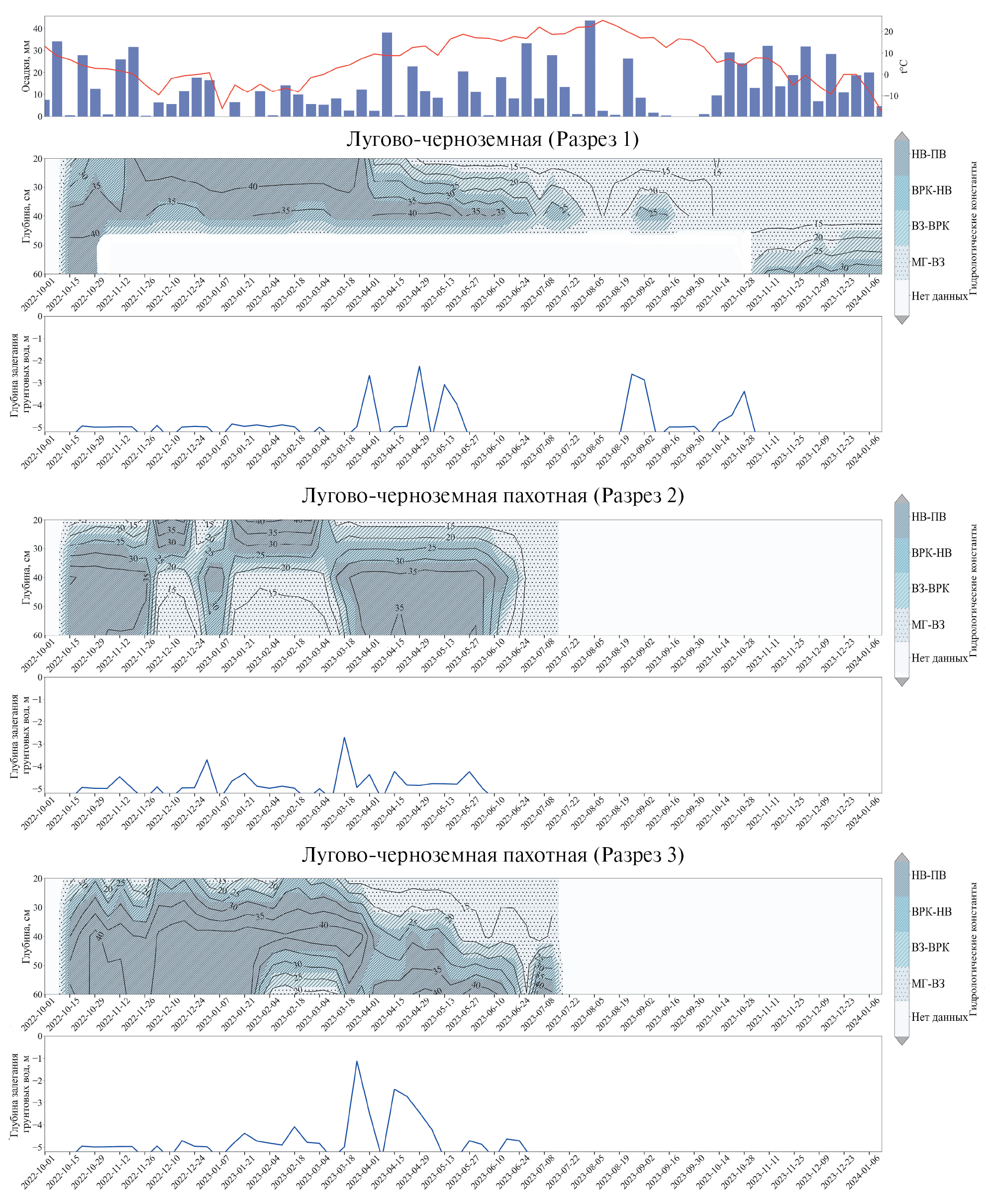 Пахотный слой лугово-черноземных почв характеризовался оптимальными значениями влажности (от ВЗ до ПВ) в течение 26 сут для почвы разреза 2 и 72 сут для почвы разреза 3. В остальное время почвы были, преимущественно, недостаточно увлажнены. Влажность почв на глубинах 40 и 60 см превышала значения НВ на начало мониторинговых наблюдений. Такие условия увлажнения продлились вплоть до начала зимы для разреза 2 и конца января – для разреза 3. В начале–середине января, после зимней оттепели в пахотной лугово-черноземной почве разреза 2 наблюдалось промачивание почвенного профиля и его увлажнение, сменяемое периодом иссушения, вероятно, за счет движения влаги вниз. Следующий максимум увлажнения на глубинах 40 и 60 см для обоих пахотных лугово-черноземных почв пришелся на конец марта и продлился до июня, сменившись иссушением. Отсутствие мониторинговых наблюдений за объемной влажностью почв с середины июля 2023 г. не позволяет достоверно определить их состояние на протяжении большей части летнего периода. Однако, полагаем, что влажность пахотных почв на глубине 20 см в летние месяцы оставалась такой же, как в почве залежи – ниже ВЗ, поскольку поступление осадков на поверхность почв было одинаково, а значения эвапотранспирации были достаточно велики, но ниже, чем в залежной почве.