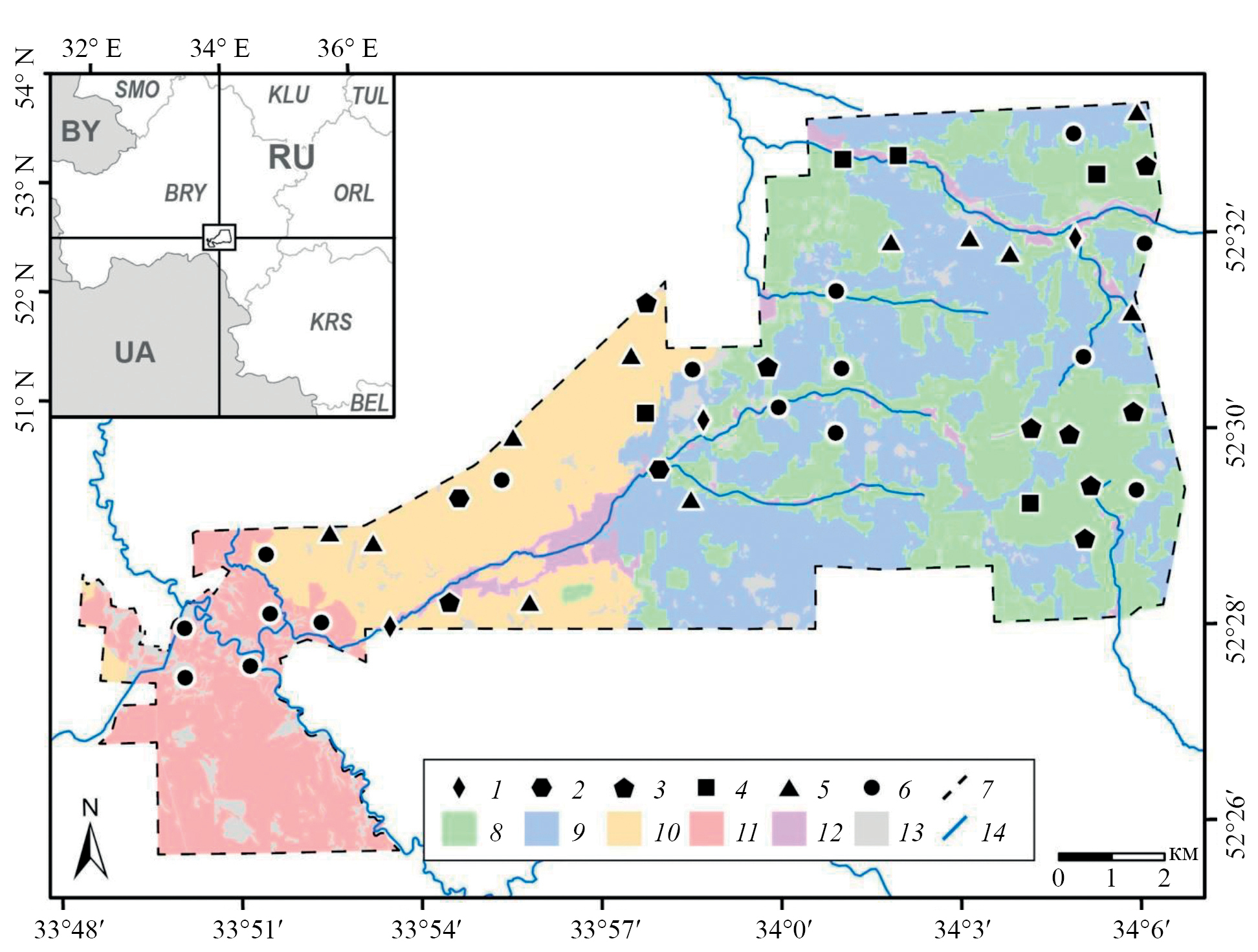 Рис. 1. Территория исследования: 1 – пробные площади в черноольшаниках нитрофильно-травяных, 2 – в березняках кустарничково-зеленомошных, 3 – в березняках неморальнотравных, 4 – в сосняках сложных, 5 – в сосняках кустарничково-зеленомошных, 6 – в широколиственных неморальнотравных лесах, 7 – граница заповедника “Брянский лес”, 8 – моренно-зандровый ландшафт, 9 – зандровый ландшафт, 10 – терраса, 11 – пойма, 12 – поймы малых рек, 13 – прочие типы ландшафта, 14 – постоянные водотоки. Обозначения стран и административных единиц на карте-врезке даны согласно ISO-3166.