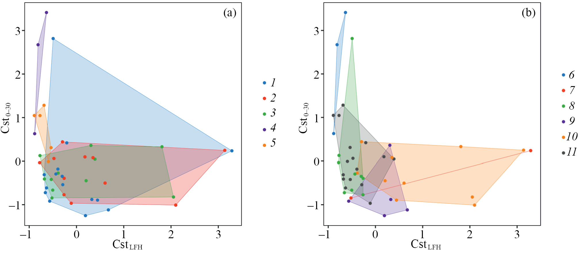 Рис. 2. Диаграмма рассеяния нормализованных значений запасов углерода (ординация) для (а) типов ландшафта: 1 – моренно-зандровый, 2 – зандровый, 3 – террасный, 4 – пойма малых рек, 5 – пойма р. Нерусса; (b) типов леса: 6 – черноольшаники нитрофильно-травяные, 7 – березняки кустарничково-зеленомошные, 8 – березняки неморальнотравные, 9 – сосняки сложные, 10 – сосняки кустарничково-зеленомошные, 11 – широколиственные неморальнотравные леса.