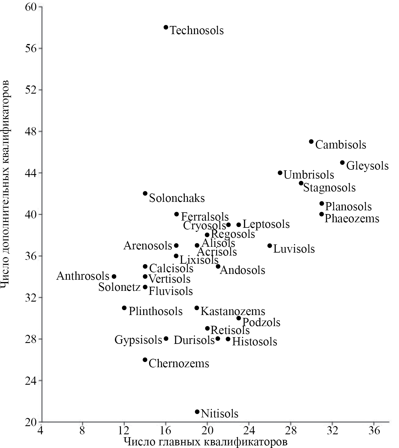 Общее количество квалификаторов в списках для РПГ колеблется от 40 до 78. На графике явно выделяется область РПГ с количествами главных квалификаторов от 10 до 25 и дополнительных от 26 до 42 (рис. 2). Меньший массив характеризуется бόльшим количеством квалификаторов: 40–48 и 28–32 соответственно, и включает почвы, встречающиеся в разных природных зонах, прежде всего, Cambisols и Gleysols. Особое место занимают Technosols со средним (небольшим) количеством главных квалификаторов и максимальным среди всех почв количеством дополнительных, поскольку почвы городов, мест добычи полезных ископаемых и прочих техногенных объектов встречаются повсеместно. Минимальное число дополнительных квалификаторов отмечено для Nitisols – почв с определенным узким набором характеристик, малыми ареалами, ясной приуроченностью к основным породам и тропическому климату с непродолжительным сухим сезоном. Кроме того, они диагностируются в ключе по уникальному горизонту nitic, отличительной чертой которого является “блеск граней структурных отдельностей”.
