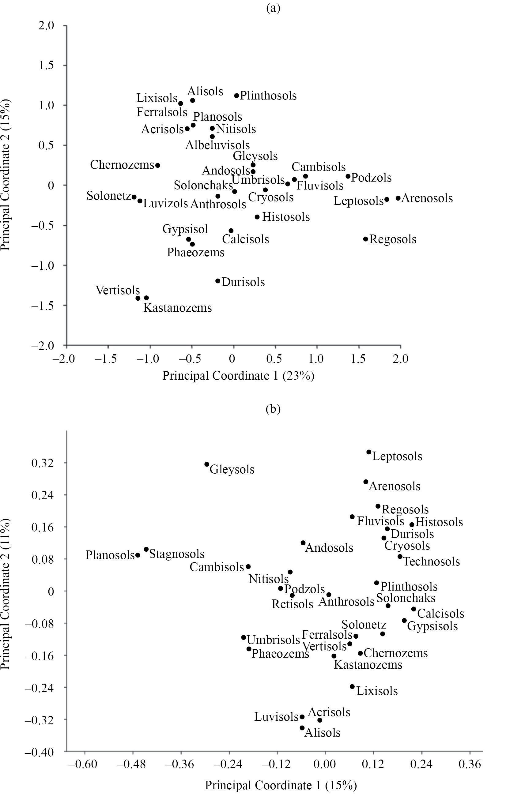 Рис. 3. Положение Реферативных почвенных групп в пространстве главных компонент: (a) – по версии WRB-2006 [13]; (b) – по версии WRB-22 [15].