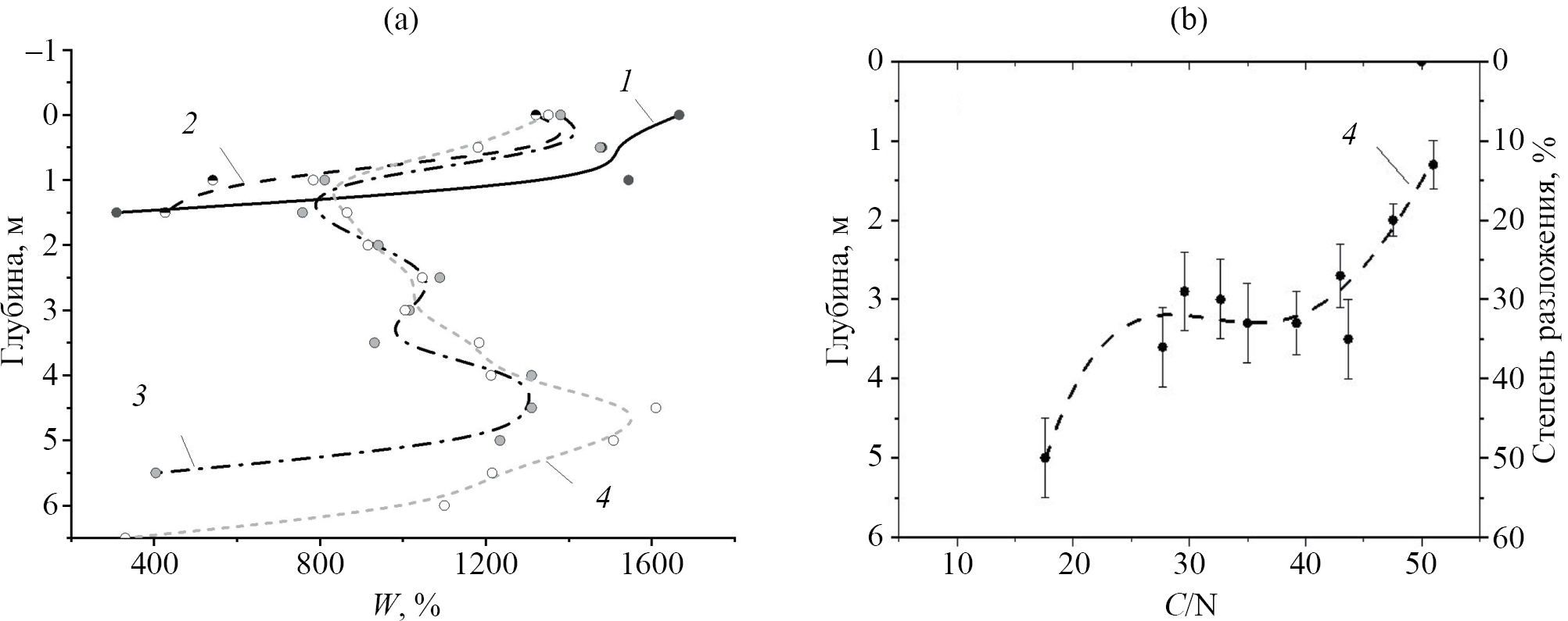 Рис. 2. Изменение влагоемкости (а) (1 – скважина 1, 2 – скважина 2, 3 – скважина 3, 4 – скважина 4) и связи соотношения C/N со степенью разложения (b) (скважина 4) по глубине торфяной залежи.