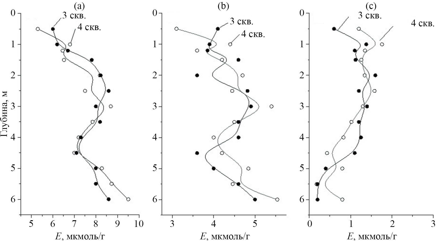 Рис. 3. Распределение функциональных групп гуминовых кислот в скважинах 3 и 4: (a) – фрагменты R–ArOH (рКа 10.4–10.7), r (Е3скв; Е4скв) = 0.79, p <0.01; (b) – фрагменты R–Ar(Cn)–COOH (рКа 7.6–7.9), r (Е3скв; Е4скв) = 0.46, p < 0.1; (c) – фрагменты R–Cn–COOH (рКа 4.0–4.6), r (Е3скв; Е4скв) = 0.67, p < 0.05.