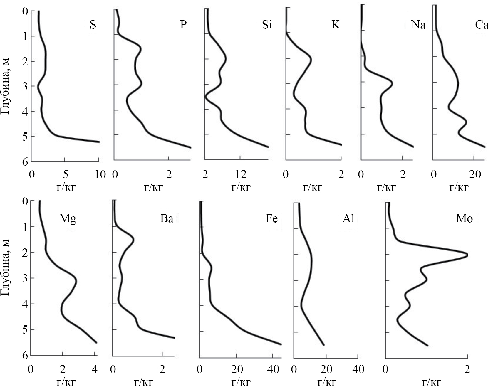 Увеличение доли макроэлементов P и Ba наблюдается в узком диапазоне глубин от 1.0 до 2.0 м. Количество элементов Si, Al, Ca, Mg, Mo, Fe и S возрастает на глубине 1.0–4.0 м. Замещение щелочных металлов калия (1–3 м) на натрий (2.5–3.5 м) может быть также причиной смены типа питания микроорганизмов. Доминирующими макроэлементами являются Si, Al и Fe. При этом изменение концентраций Si и Al с увеличением глубины торфяной залежи имеет схожий характер. Таким образом, смена растительности в процессе формирования болота и перехода от эвтрофной к мезотрофной стадии способствовала накоплению алюмосиликатных минералов, которые, в свою очередь, сформировали природный органоминеральный комплекс.
