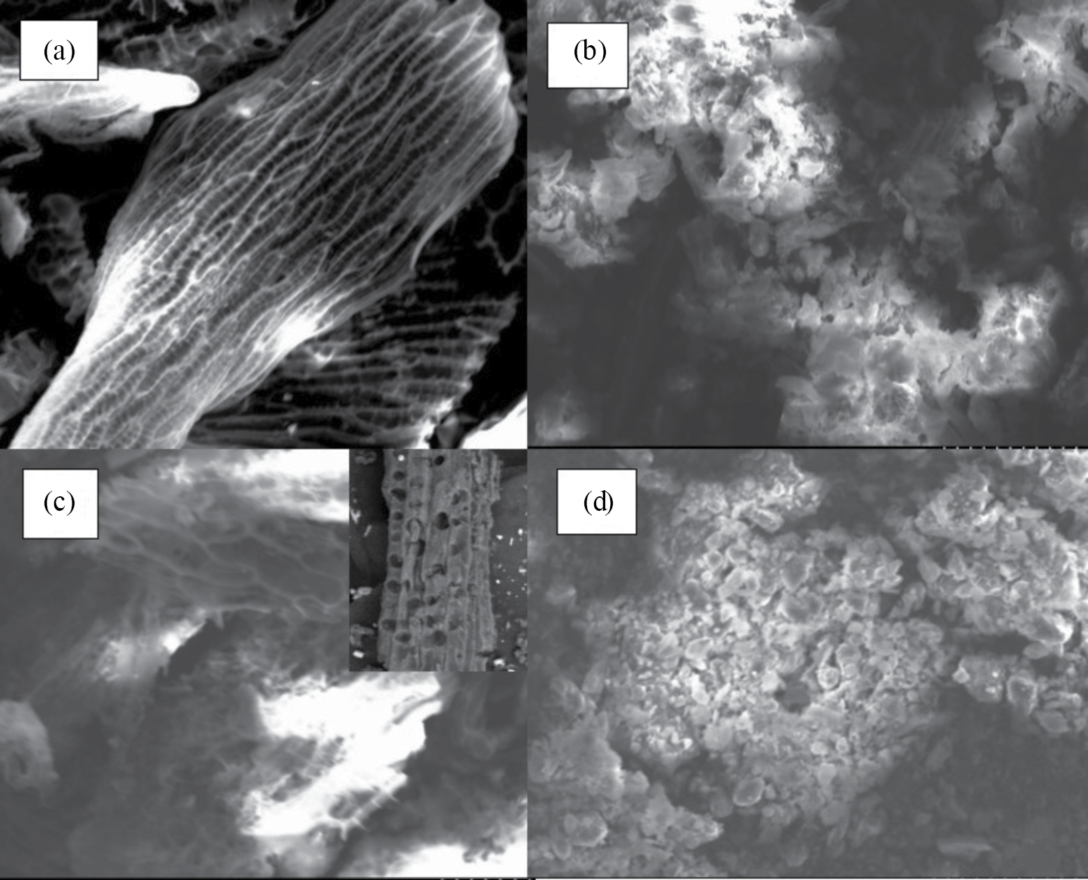 Рис. 5. Структурные особенности торфа по данным СЭМ на разной глубине торфяной залежи (100 мкм): (a) – 0–0.5 м; (b) – 1.0–3.5 м; (c) – 4.0–5.0 м; (d) – 5.0–6.5 м.