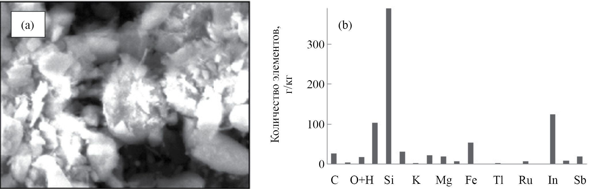Рис. 6. Внешний вид сапропелевого слоя и элементное распределение на глубине 6.0–6.5 м: (a) – СЭМ-фотография сапропеля с микрокристаллами (50 мкм); (b) – химический состав сапропеля на основе энергодисперсионного спектрального анализа.