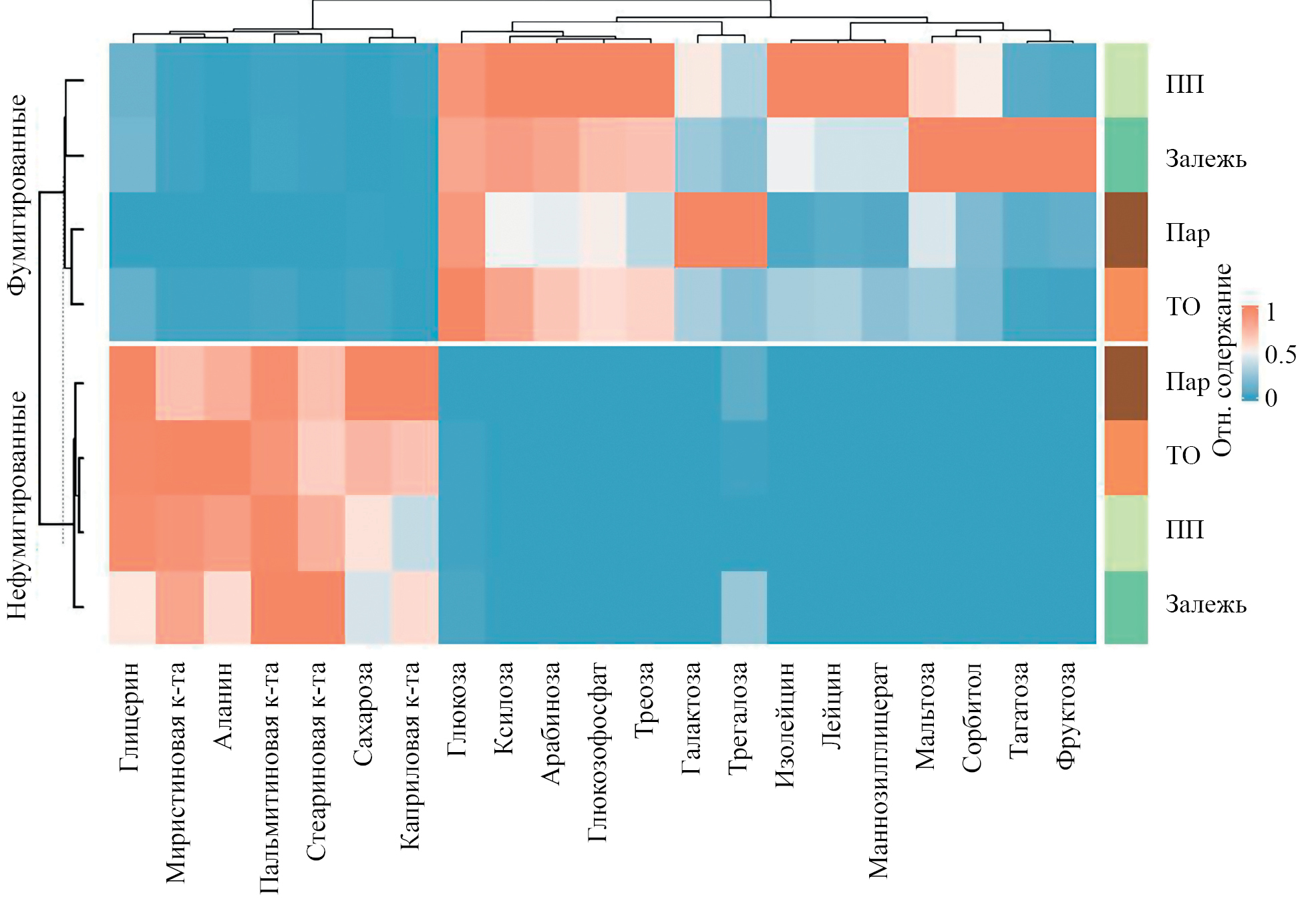 Кластерный анализ метаболомных профилей нефумигированных черноземов показал, что наибольшие различия наблюдаются для профилей вариантов залежь и пар, различия между вариантами ТО и ПП слабо выражены. Наблюдаемые отличия были связаны преимущественно с метаболитами жирных кислот вторичного метаболизма растений. Почва варианта пар характеризовалась минимальным относительным содержанием стеариновой кислоты – соединения, связанного с метаболизмом жирных кислот и биосинтезом вторичных метаболитов растений [49]. Принимая во внимание, что одновременно в этом варианте было обнаружено наибольшее относительное содержание сахарозы, утилизация которой в почве часто интенсифицируется в присутствии ризосферных микроорганизмов [49], наблюдаемые особенности метаболома почвы варианта пар могут объясняться отсутствием растений. В метаболоме почвы варианта залежь, напротив, относительное содержание сахарозы было минимальным, а стеариновой кислоты – максимальным. Группировка исследованных вариантов черноземов по составу метаболитов фумигированной почвы указывает на влияние вспашки и ассоциирована преимущественно с составом эндометаболитов: в пахотных черноземах по сравнению с непахотными заметна тенденция уменьшения доли углеводов (мальтоза, ксилоза, арабиноза, треоза), липидов (глицерин, стеариновая кислота) и аминокислот (лейцин, изолейцин).