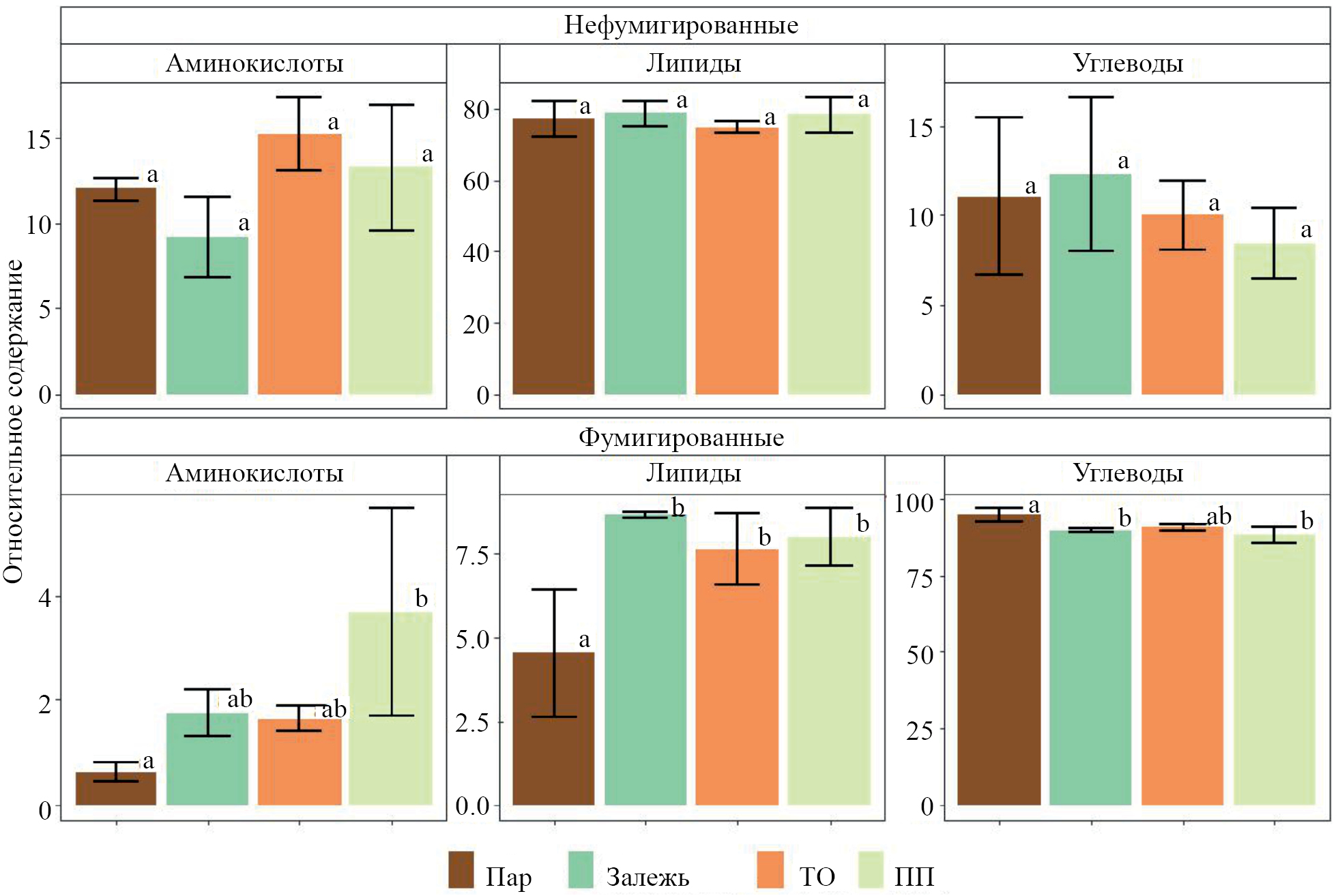 Для обобщенной оценки влияния вида использования на метаболомные профили черноземов идентифицированные молекулы были разделены в зависимости от принадлежности к определенному типу обмена веществ: аминокислоты участвуют в азотистом обмене, жирные кислоты и глицерин – компоненты липидного обмена, а сахара и их производные относятся к компонентам углеводного обмена (рис. 3, табл. S1). Показано, что среди метаболитов нефумигированных черноземов доминируют липиды, а после фумигации – углеводы. Влияние вида использования на групповой состав метаболитов нефумигированных черноземов не выявлено, для фумигированных вариантов обнаружены достоверные различия по всем выделенным группам, что, вероятно, связано с различиями в составе микробной биомассы [6, 52]. На основании сравнения относительного содержания аминокислот и липидов выявлены статистически значимые различия между черноземом варианта пар и другими почвами, в то время как почвы вариантов залежь, ПП, ТО не различались между собой. Заметно, что для пахотных вариантов по сравнению с непахотными характерна высокая доля углеводов, а также низкие доли аминокислот и липидов. Наблюдаемые закономерности предположительно обусловлены различием в происхождении почвенных метаболитов: для пахотных вариантов преимущественно микробное, а для непахотных – растительное [38]. Наиболее контрастные различия наблюдались между черноземами вариантов залежь и пар. Похожие, но менее выраженные различия были между почвами вариантов ПП и ТО. Полученные результаты по групповому метаболитному составу согласуются с данными по составу термолабильных фракций ПОВ типичных черноземов различного землепользования [9], которые так же как Свэ могут характеризовать лабильный пул ПОВ.