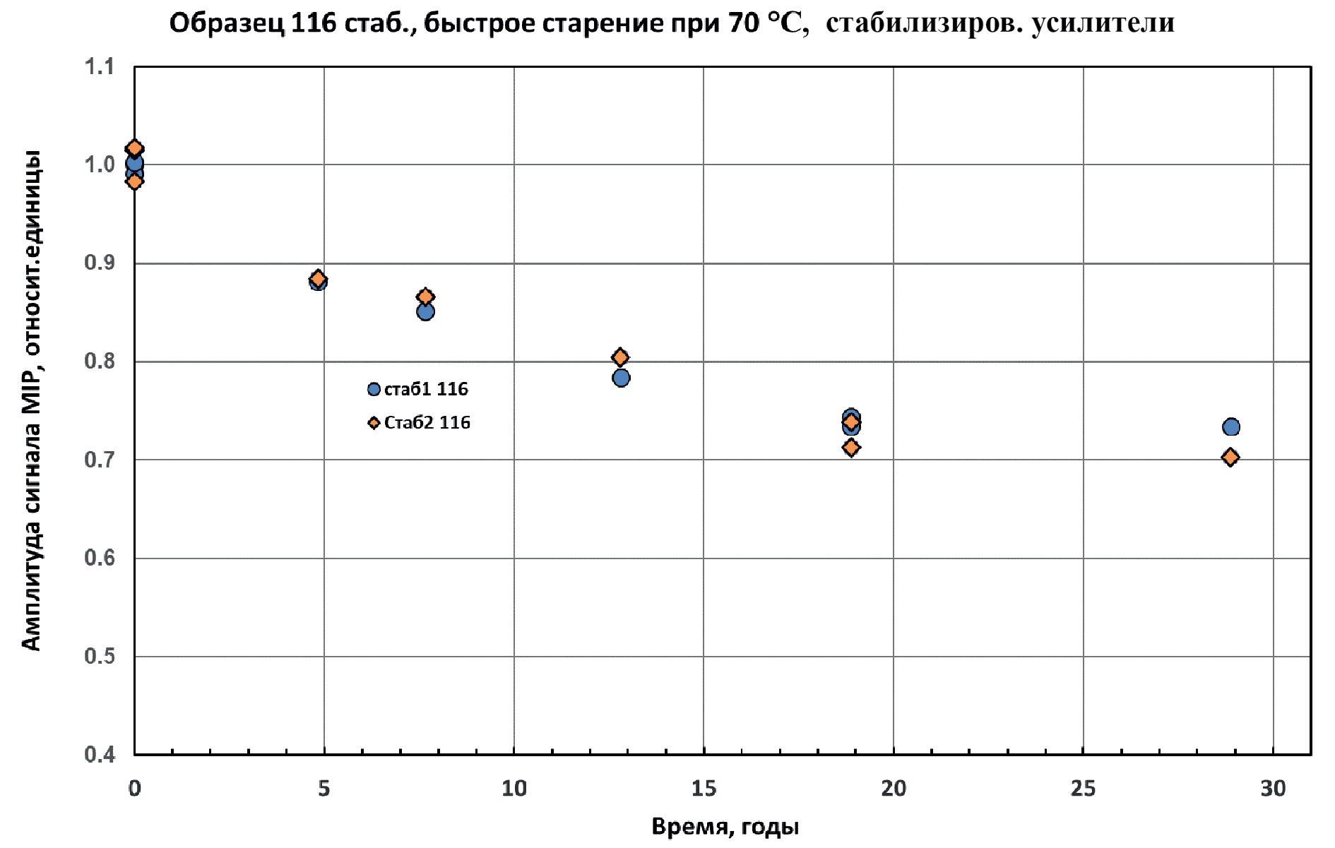 Рис. 5. Зависимость амплитуды сигналов MIP от прототипа сцинтилляционного счетчика № 116 от времени во втором сеансе ускоренного старения, после 2.5 лет выдержки после первого старения, при температуре 70 ˚C. Стаб1 и Стаб2 – сигналы от различных полос сцинтиллятора.