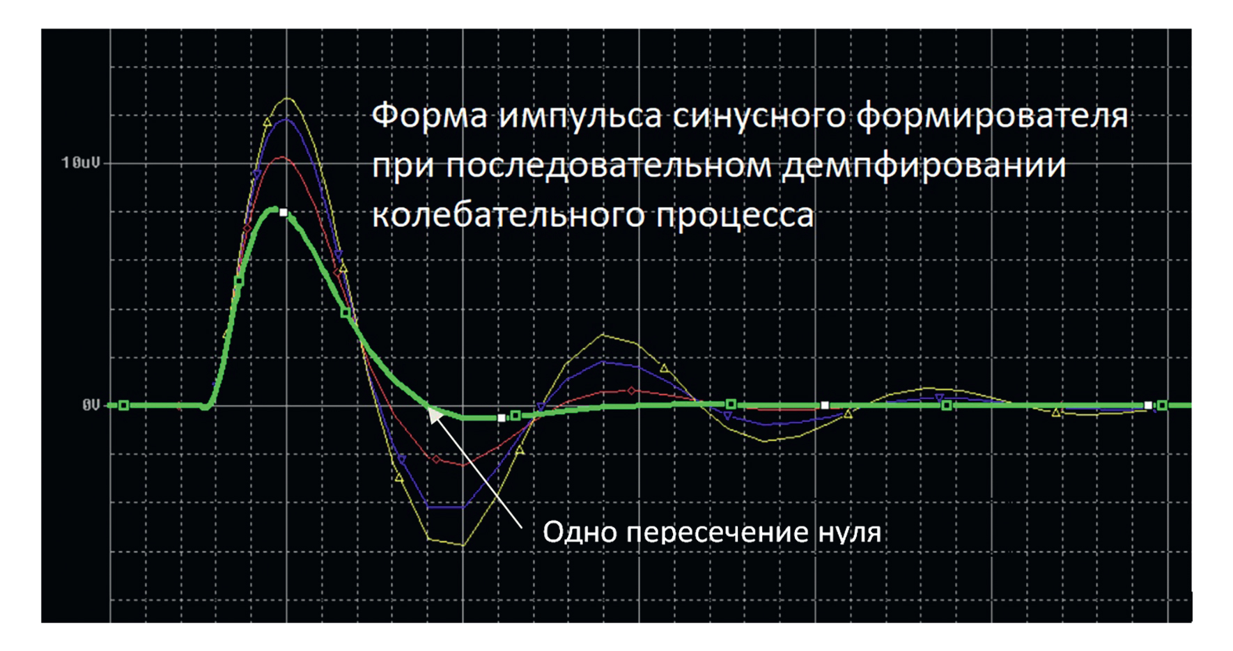 Синусный импульс (зеленый график на рис. 5) формируется с незначительным пересечением нуля, которое необходимо для увеличения скорости экспоненциального спада заднего фронта импульса.