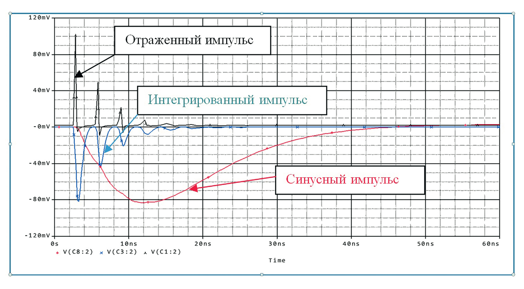 Одной из задач модернизации ТОТ-метода являлось создание формирователя импульса, нечувствительного к искажению формы исходного воздействия, например, при наложении отраженного сигнала в соединительном кабеле. В модели (рис. 4) это представлено в виде рассогласования 50-омного коаксиального кабеля с 25-омной нагрузкой.