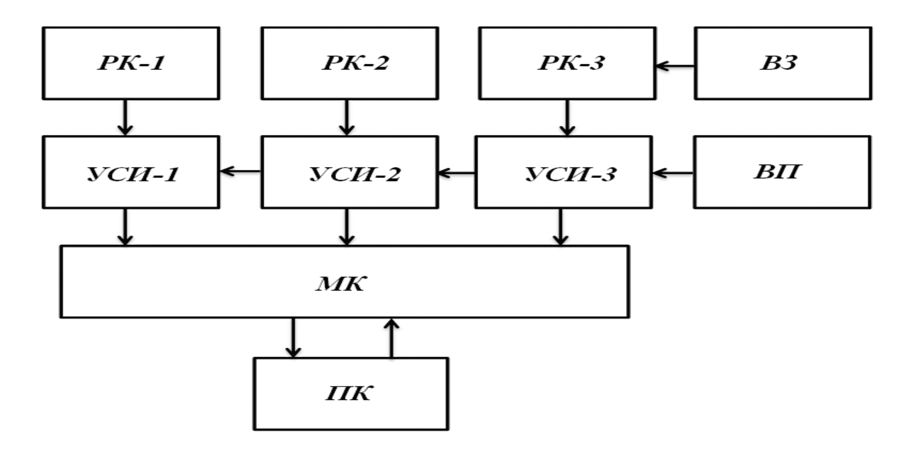 Рис. 1. Структурная схема радиометрического устройства: РК-1, РК-2, РК-3 – рабочие камеры с альфа-, бета- и гамма-детекторами, УСИ-1, УСИ-2, УСИ-3 – узлы усиления и селекции информации (аналоговая часть), МК – микроконтроллер (цифровая часть), ВП – узел вторичного электропитания, ВЗ – воздухозаборник, ПК – персональный компьютер с установленным программным обеспечением [11].