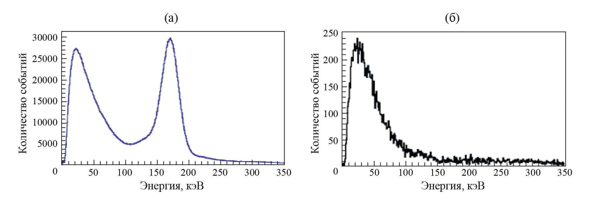 Благодаря высокому световому выходу, низкому уровню электронных шумов и высокой квантовой эффективности фотодетектора GAGG, рассеиватель позволяет регистрировать низкую энергию отдачи электронов с порогом около 1–2 кэВ. Это подтверждается измеренным энергетическим спектром сигналов в промежуточном рассеивателе, представленном на рис. 7 для двух типов записанных событий с регистрацией и без регистрации рассеянных фотонов в NaI(Tl)-счетчиках. В последнем случае (рис. 7а) удается зарегистрировать фотоны с углом рассеяния около 180○ в основном рассеивателе и поглощенные в GAGG-сцинтилляторе. Эти события формируют пик в районе 170 кэВ в энергетическом спектре, который используется для постоянной энергетической перекалибровки в процессе набора экспериментальных данных. Отметим, что, согласно расчетам Монте-Карло, энергетический спектр должен быть почти плоский в диапазоне энергий от 0 до 20 кэВ. Провал в спектре с энергиями ниже 20 кэВ (рис. 7б) обусловлен более низкой эффективностью идентификации низкоамплитудных сигналов из-за работы алгоритма подавления электронных шумов. Эффективность регистрации низких энергий может быть улучшена с использованием комбинированного метода низкочастотной фильтрации электронных шумов и идентификации полезных сигналов по форме импульса, который в настоящее время находится в разработке.
