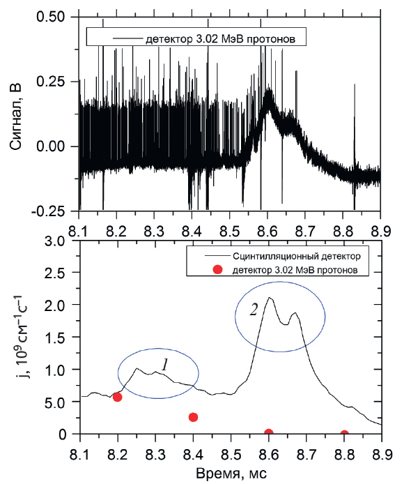 Рис. 9. Сигнал протонного детектора во временном интервале от 8.1 до 8.9 мс в момент вспышки рентгеновского излучения (верхний график). Сигнал сцинтилляционного детектора (нижний график). Точками показан измеренный по количеству протонов выход реакции синтеза. Цифрами 1 и 2 обозначены вспышки рентгеновского излучения, зарегистрированные сцинтилляцинным датчиком.
