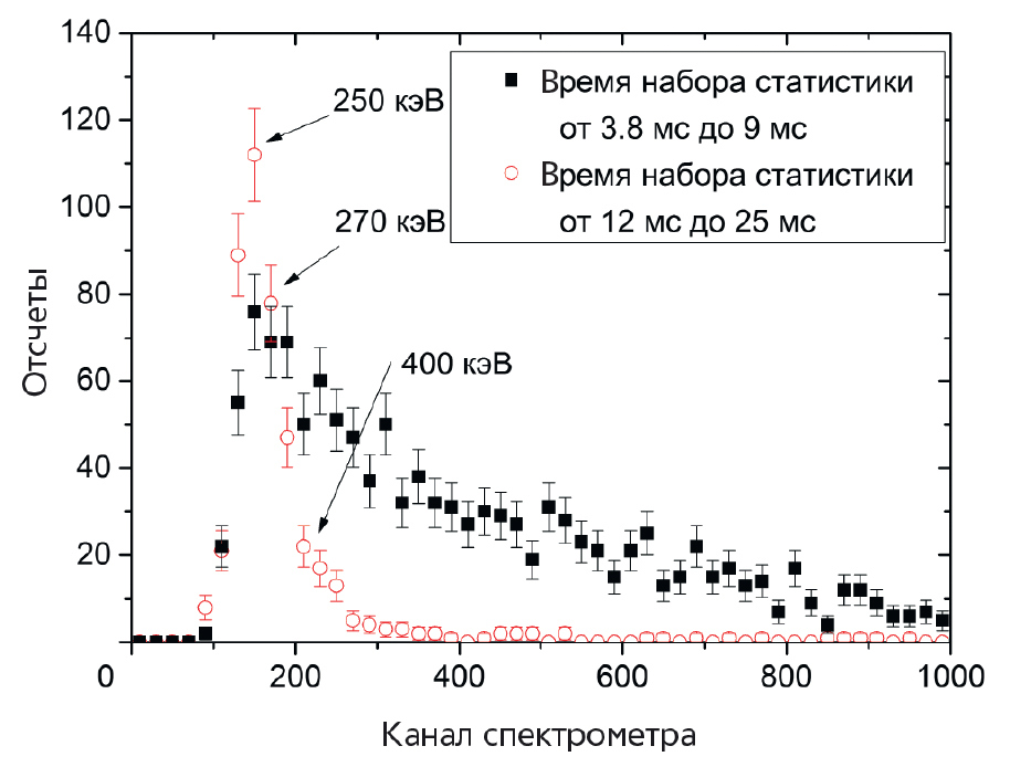 Во временном интервале от 12 до 25 мс в нейтронном канале спектрометра события отсутствуют, а в гамма-канале зарегистрирован спектр комптоновских электронов, приведенный на рис. 12. Стрелками указаны максимальные энергии рентгеновских (или гамма-) квантов, при регистрации которых в стильбеновом сцинтилляторе возникают комптоновские электроны соответствующих энергий. Таким образом, вспышка рентгена свидетельствует о наличии в плазме перегретых электронов с энергией до 500 кэВ.