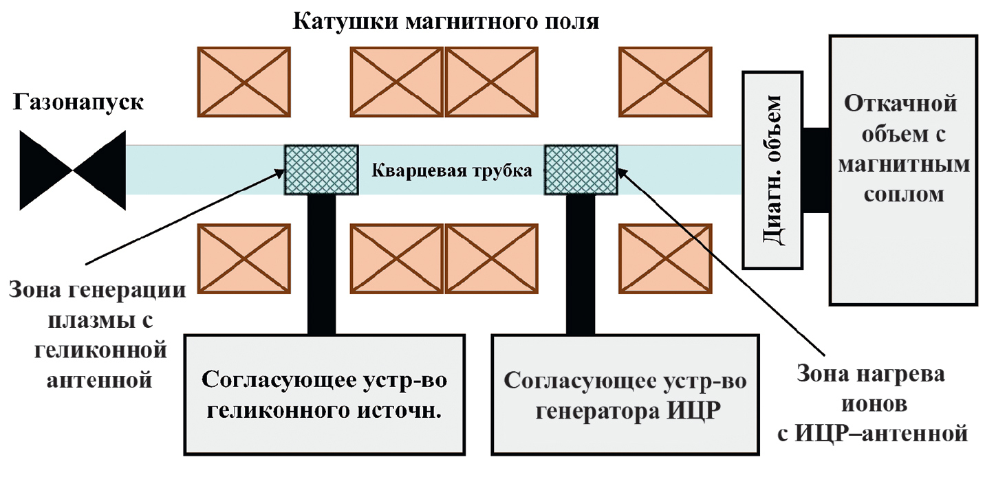 Измерения проводились в НИЦ “КИ” на установке ПН-3, экспериментальном стенде для исследования плазменных процессов в безэлектродных плазменных ракетных двигателях (БПРД) [7]. Принципиальная схема установки представлена на рис. 1. Стенд включает зону генерации плазмы, зону нагрева ионов и магнитное сопло, где происходит формирование плазменного потока. Каждая зона размещается в продольном магнитном поле, обеспечивающем термоизоляцию плазменного потока от стенок и элементов конструкций. Разряд формируется внутри кварцевой трубки длиной 1.5 м и диаметром 70 мм. В качестве рабочего газа используется аргон.