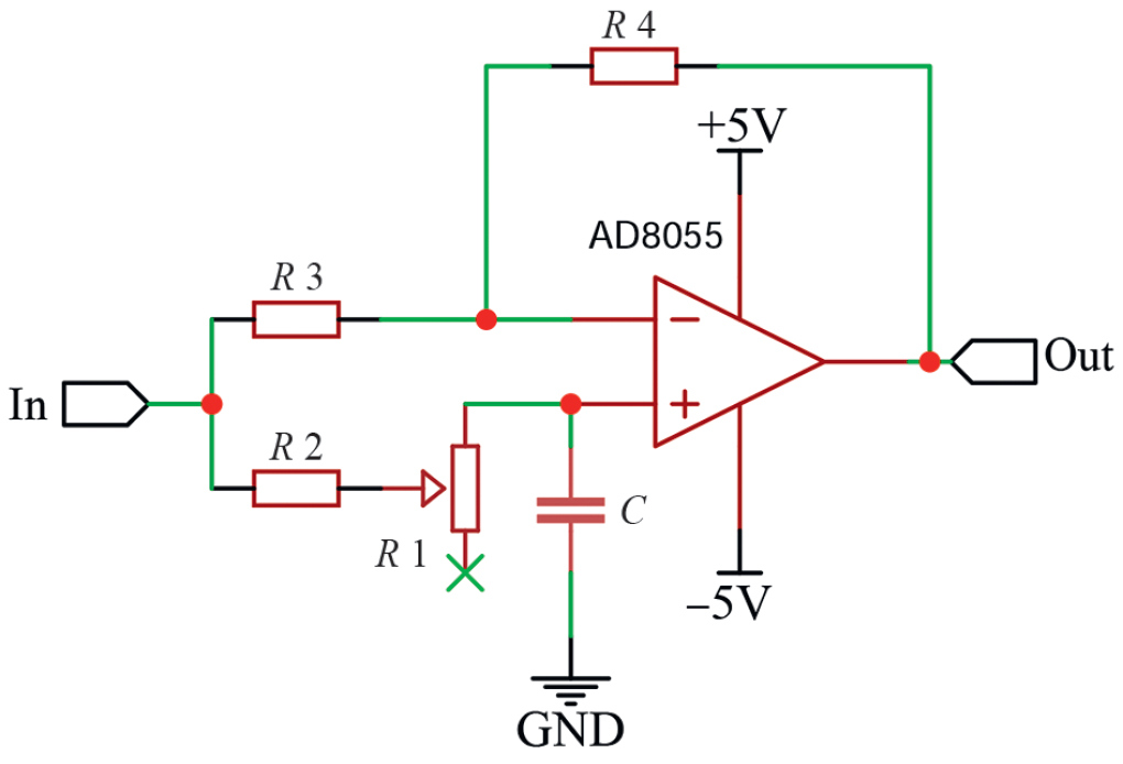 В ходе измерений усиленный сигнал ПЧ2 поступал на входы смесителей AD835. Референсный сигнал с частотой fref = 200 кГц также подавался на входы этих смесителей, причем на вход первого смесителя он поступал без смещения по фазе, а на вход второго смесителя – с задержкой в 90°. Поворот фазы осуществлялся фазовращателем на базе ОУ AD8055 (рис. 5). При использовании резисторов R3 и R4 одинакового номинала коэффициент усиления по амплитуде для данной схемы составляет K = 1, а величина поворота фазы определяется формулой