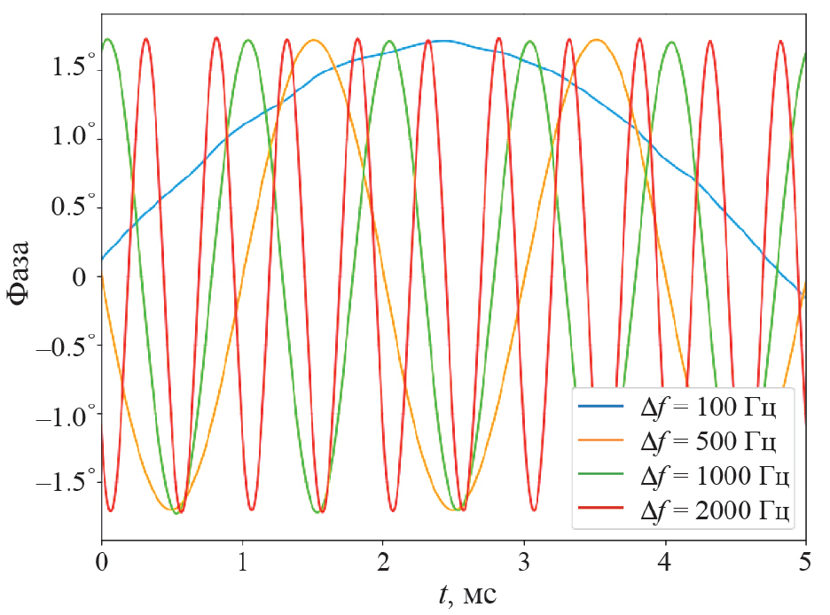 Увеличение амплитуды шумов при обработке сигналов, имеющих сдвиг частоты Δf относительно друг друга, связано с появлением синусоидальной компоненты, амплитуда которой составляет A = 1.7°, а частота равна Δf. Эта компонента для каждой из четырех величин частотного сдвига Δf показана на рис. 8. При обработке каждого сигнала фазы из представленных на рисунке вычиталась линейная компонента, после чего сигнал пропускался через полосовой фильтр шириной Δf = 2 кГц.