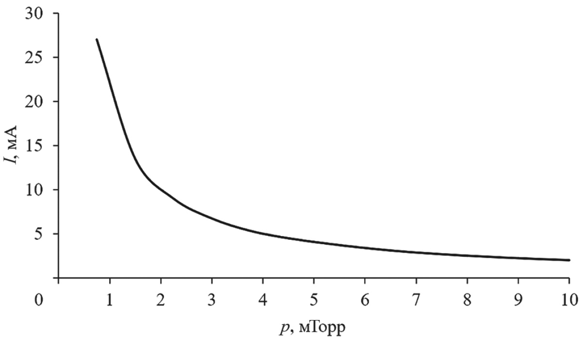Используя формулу (8), проведем расчет вытягиваемого тока из ПИИ камеры ИЭУП согласно рис. 2 (с учетом электронной компоненты), исходя из базисного значения выхода нейтронов Y = 106 нейтр./с при реализации DD-реакции и непрерывном режиме генерации нейтронов. Выход 106 нейтр./с позволяет использовать камеру ИЭУП в широком ряде практических задач и научных исследований и не требует работ в предельно нагруженных электрических режимах. В расчетах использовались следующие значения прозрачности катода, эффективности ускорения и максимального числа пролетов: η = 0.7, ξ = 0.85, Nmax = 12. Напряжение на катоде U = 100 кВ. Давление варьировалось от 1 до 10 мТорр, что является характерным рабочим давлением ПИИ. В таком случае межэлектродный ток камеры ИЭУП будет находиться в диапазоне от 2 до 22 мА для давлений от 10 до 1 мТорр соответственно. Фактически это требование к суммарному току, вытягиваемому из ПИИ, для обеспечения заданного уровня выхода нейтронов Y. Зависимость значения вытягиваемого тока I от рабочего давления исследуемой камеры ИЭУП приведена на рис. 4.