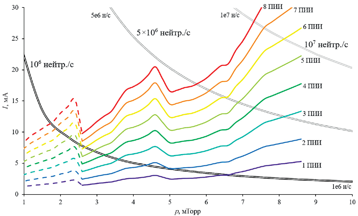 Экспериментальное изучение характеристик ПИИ показало, что оптимальное напряжение питания ПИИ составляет 1.2–1.7 кВ с точки зрения достижения наибольших токов IПИИ. Зависимости IПИИ и вытягиваемого тока I показали наличие двух областей горения разряда, условно при низком давлении (1–2 мТорр) и высоком давлении (4–5 мТорр и более). По зависимости I(p) определено несколько приоритетных режимов работы ПИИ для достижения выхода нейтронов 106 нейтр./с. На основе экспериментальных и расчетных данных построено семейство зависимостей I(p) для разного числа ПИИ, используемых в камере ИЭУП, и для разных выходов нейтронов, по которым можно определять требуемый вытягиваемый из ПИИ ток, рабочее давление и число ПИИ для обеспечения требуемого выхода нейтронов в камере ИЭУП составляет 106–107 нейтр./с.
