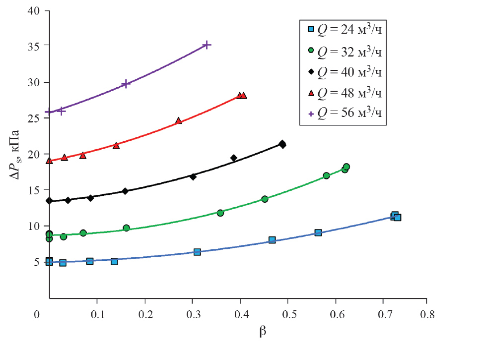Результаты экспериментальных исследований, представленные на рис. 2 и 3, показывают, что перепады давления для обоих СУ существенно различаются как по абсолютным величинам, так и по чувствительностям d∆P/dβ и d∆P/dQ, которые заметно выше для СУ 70/50 мм во всем диапазоне β. Покажем теперь, как можно использовать эти данные для достижения поставленной цели.