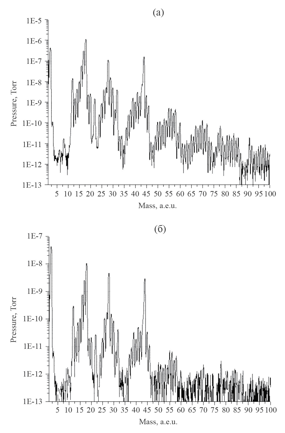 Рис. 2. Спектр остаточных газов керамического сцинтиллятора Р43 до прогрева через 24 ч после старта откачки (а) и после прогрева через 5 дней после остывания до RT9 (б).