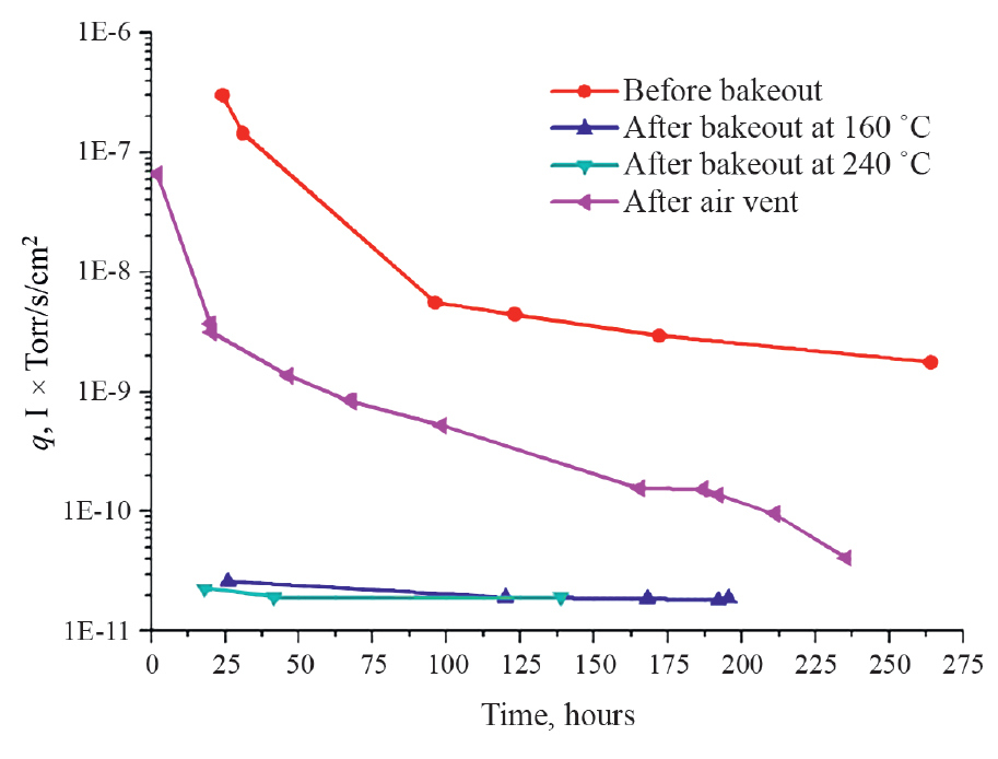 Как следует из табл. 1, каждый последующий прогрев уменьшает коэффициент газовыделения даже после воздействия воздуха при атмосферном давлении, при этом после напуска воздуха коэффициент термодесорбции меньше на порядок в сравнении с первоначальными измерениями. Объяснение этому кроется в том, что до того, как начались вакуумные испытания, образец находился без вакуумной “гигиены” на воздухе при атмосферном давлении около года. В нашем же случае образец находился без вакуума не более 24 ч до последующей откачки [5].
