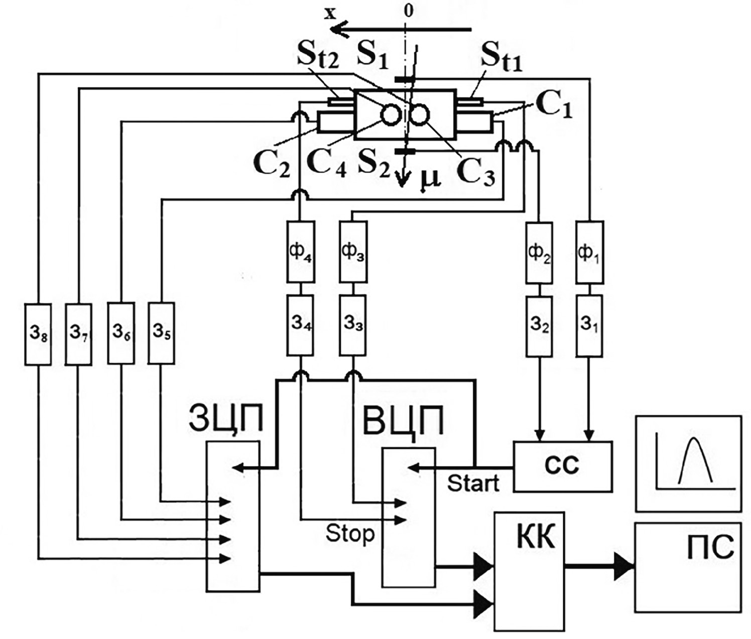 Блок-схема калибровки САКС представлена на рис. 2. Сигналы с триггерных счетчиков S1 и S2 размером 10×10×1 см3 через формирователи Ф1, Ф2 и задержки З1, З2 подавались на входы схемы совпадений СС. Длительность сигналов составляла 10 нс. Сигнал со схемы совпадений СС длительностью 350 нс являлся триггерным сигналом Start для запуска четырех блоков на входе зарядо-цифрового преобразователя (ЗЦП) и время-цифрового преобразователя (ВЦП). На входы Stop блока ВЦП через блоки формирователей Ф3, Ф4 и блоки задержек З3, З4 подавались сигналы от ФЭУ-85 координатной системы St1 и St2. На входы ЗЦП через блоки задержек З5 — З8 подавались сигналы от четырех ФЭУ-49 амплитудной системы C1—C4. Сигнал Start являлся также сигналом, с помощью которого через крейт-контролер системы CAMAC проводилась запись сигналов в память компьютера.