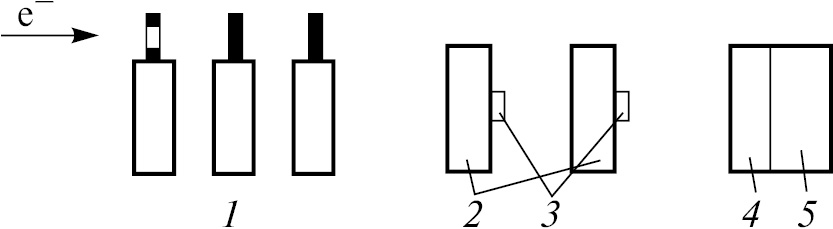 Рис. 1. Схема установки для измерения характеристик детекторов на пучке электронов ускорителя “Пахра” (ФИАН, Троицк): 1 — пучковые счетчики, 2 — образцы сцинтилляторов, 3 — фотодиоды, 4 — кварцевый черенковский радиатор, 5 — MCP ФЭУ.