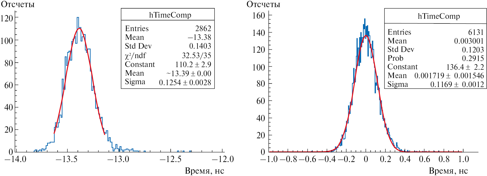 Рис. 2. Результаты измерения временного разрешения для сцинтилляционного детектора со сцинтиллятором ОИЯИ и фотодетектором EQR15 11-6060D-S на космических мюонах (слева) и пучке электронов (справа).