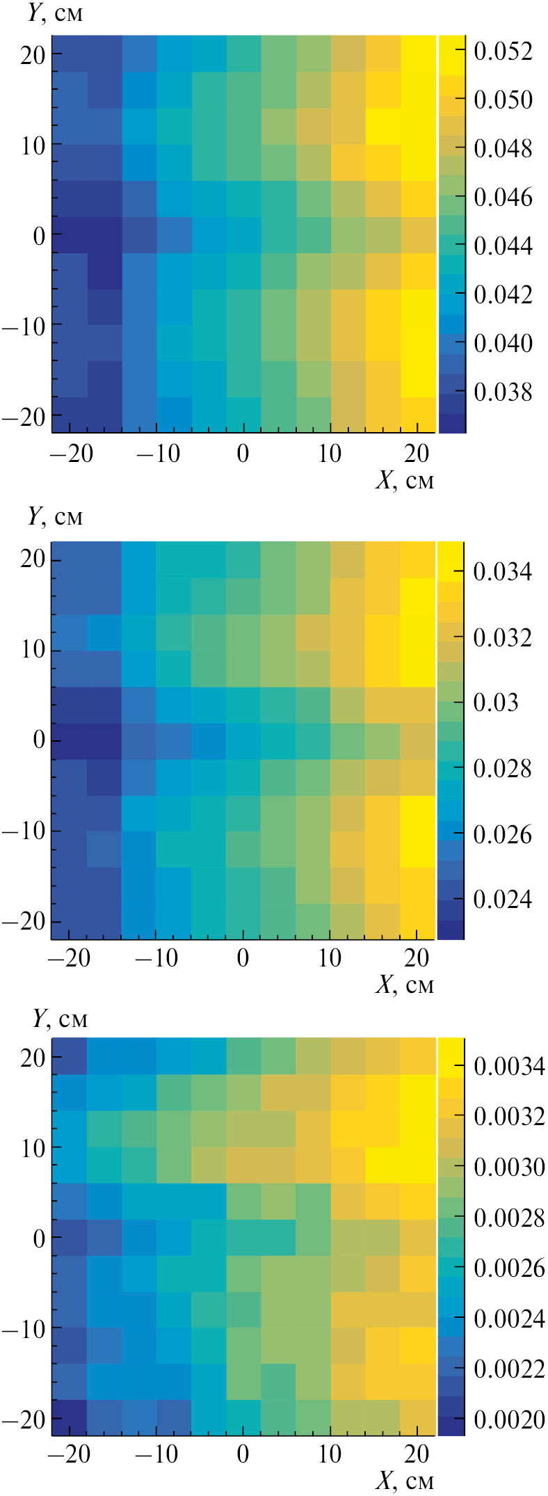 Распределение попаданий всех частиц в ячейки слоя VETO без отбора по времени показано на верхнем графике рис. 8. Аналогичное распределение с отбором по времени 25 нс показано на рис. 8 в центре. Большая частота попаданий наблюдается на стороне VETO, которая находится ближе к оси луча. Частота попаданий нормирована на одно взаимодействие в мишени. При максимальной ожидаемой частоте взаимодействий около 7 кГц частота попаданий в одиночной ячейке VETO ожидается не более 350 в секунду. Из-за низкой частоты попаданий вероятность наличия двух и более попаданий в один сцинтиллятор составляет менее 0.3% (рис. 8 снизу).