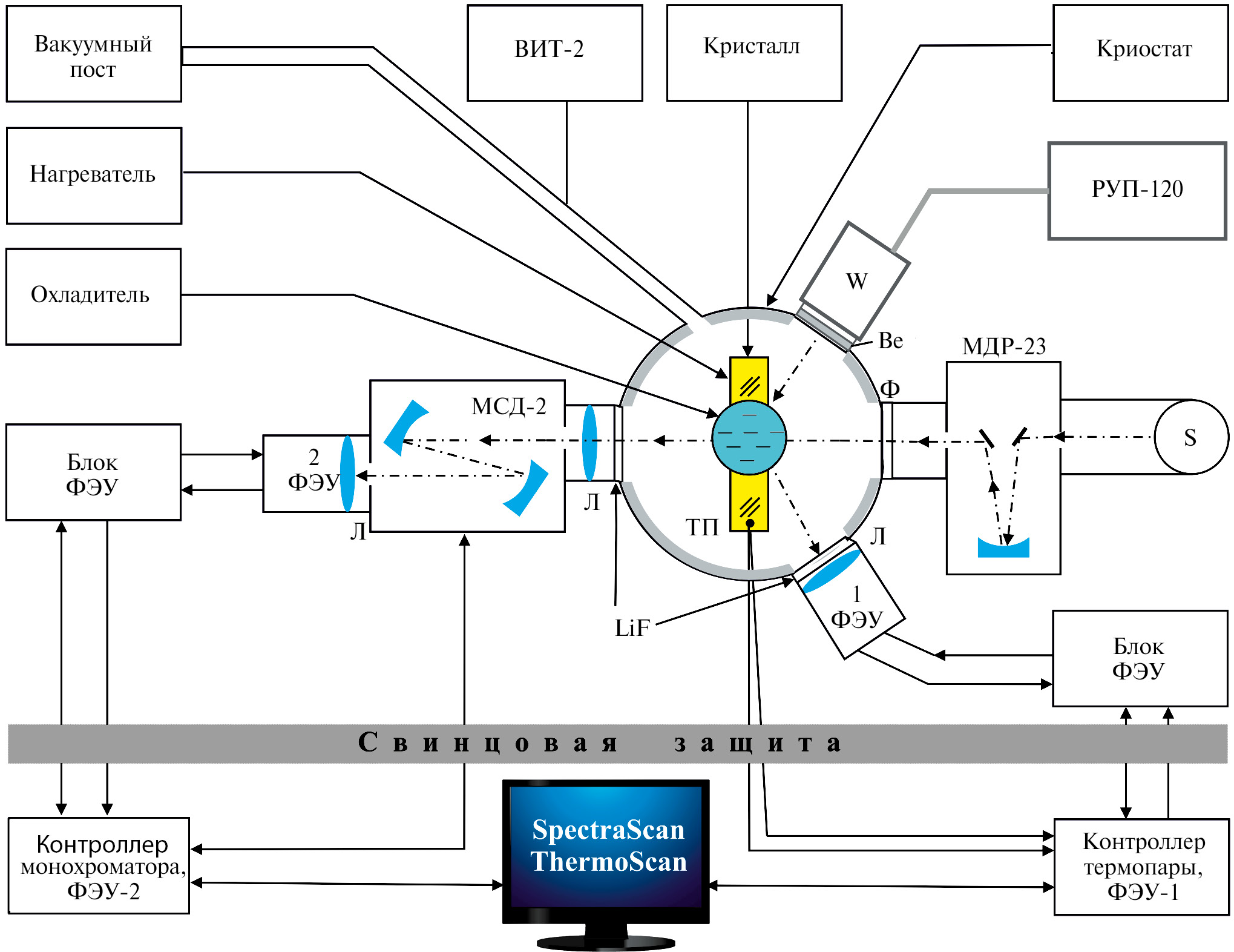 Рис. 1. Блок-схема люминесцентного комплекса. Зона экспериментатора отделена свинцовой защитой толщиной 10 мм, Л — линза кварцевая, ФЭУ — фотоэлектронный умножитель Н 8259-01 “Hamamatsu”, МСД-2 — монохроматор, ВИТ-2 — вакуумметр, РУП-120 — пульт управления рентгеновского аппарата, W — рентгеновская трубка с вольфрамовым антикатодом, LiF — литий-фторовое окно, Ве — бериллиевое окно, МДР-23 — монохроматор, Ф — фильтр, S — лампа накаливания.