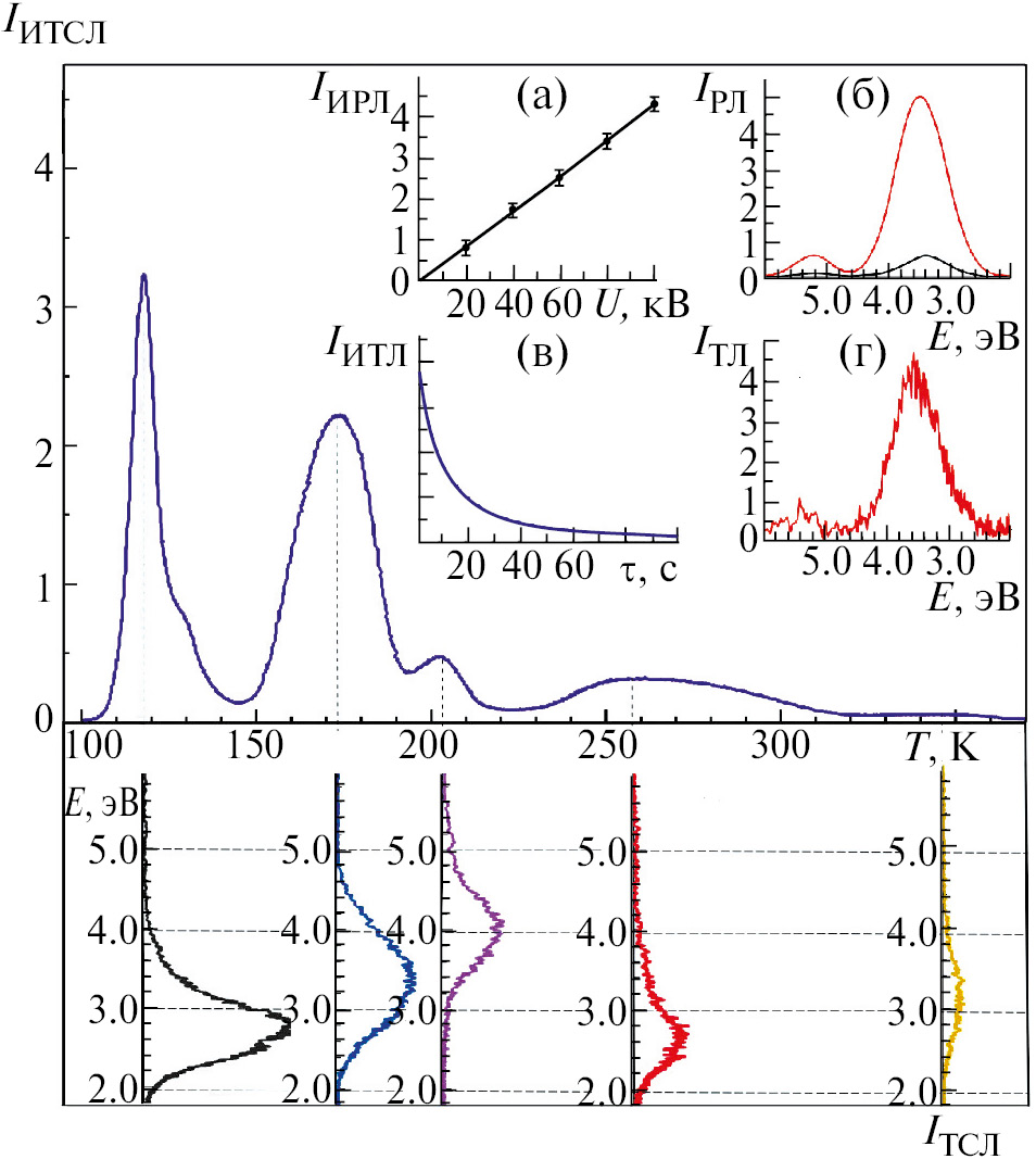 Низкая температура способствует формированию близко расположенных радиационных дефектов, а длительность облучения увеличивает их концентрацию, благодаря чему происходит туннелирование между основными состояниями электронных и дырочных радиационных дефектов, например между F’- и VK-центрами. После полного затухания ИТЛ приступили к регистрации интегральной термостимулированной люминесценции IИТСЛ = f(T) (верхняя панель на рис.2) и спектров IТСЛ = f(hν) (нижняя панель на рис.2).